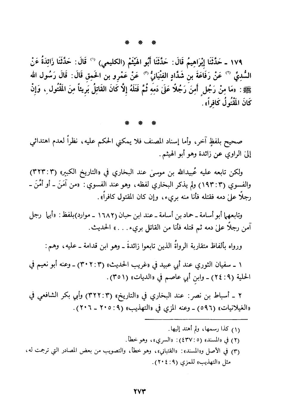 179 - حَدَّثَنَا إِبْرَاهِيمُ قَالَ: حَدَّثَنَا أَبُو الْهَيْثَمِ الْكَلِيمِيُّ قَالَ: حَدَّثَنَا زَائِدَةُ، عَنِ السُّدِّيِّ، عَنْ رِفَاعَةَ بْنِ شَدَّادٍ الْفِتْيَانِيِّ، عَنْ عَمْرِو بْنِ الْحَمِقِ قَالَ: قَالَ رَسُولُ اللَّهِ صَلَّى اللهُ عَلَيْهِ وَسَلَّمَ: §" مَا مِنْ رَجُلٍ أَمِنَ رَجُلًا عَلَى دَمِهِ ثُمَّ قَتَلَهُ إِلَّا كَانَ الْقَاتِلُ بَرِيئًا مِنَ الْمَقْتُولِ وَإِنْ كَانَ الْمَقْتُولُ كَافِرًا