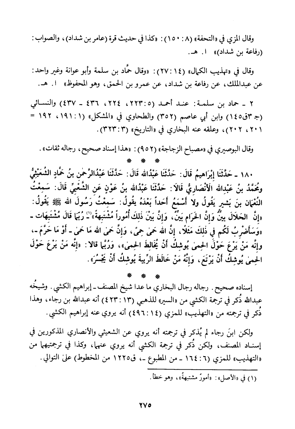 180 - حَدَّثَنَا إِبْرَاهِيمُ قَالَ: حَدَّثَنَا عَبْدُ اللَّهِ قَالَ: حَدَّثَنَا عَبْدُ الرَّحْمَنِ بْنُ حَمَّادٍ الشُّعَيْثِيُّ، وَمُحَمَّدُ بْنُ عَبْدِ اللَّهِ الْأَنْصَارِيُّ قَالَا: حَدَّثَنَا عَبْدُ اللَّهِ بْنُ عَوْنٍ، عَنِ الشَّعْبِيِّ قَالَ: سَمِعْتُ النُّعْمَانَ بْنَ بَشِيرٍ، يَقُولُ: وَلَا أَسْمَعُ أَحَدًا بَعْدَهُ يَقُولُ: سَمِعْتُ رَسُولَ اللَّهِ صَلَّى اللهُ عَلَيْهِ وَسَلَّمَ يَقُولُ: §«إِنَّ الْحَلَالَ بَيِّنٌ، وَإِنَّ الْحَرَامَ بَيِّنٌ وَإِنَّ بَيْنَ ذَلِكَ أُمُورًا مُشْتَبِهَةً رُبَّمَا قَالَ مُشْتَبِهَاتٍ، وَسَأَضْرِبُ لَكُمْ فِي ذَلِكَ مَثَلًا إِنَّ اللَّهَ حَمَى حِمًى، وَإِنَّ حِمَى اللَّهِ مَا حَمَى أَوْ مَا حَرَّمَ، وَإِنَّهُ مَنْ يَرْعَ حَوْلَ الْحِمَى يُوشِكُ أَنْ يُخَالِطَ الْحِمَى» وَرُبَّمَا قَالَا: «إِنَّهُ مَنْ يَرْعَ حَوْلَ الْحِمَى يُوشِكُ أَنْ يَرْتَعَ، وَإِنَّهُ مَنْ خَالَطَ الرِّيبَةَ يُوشِكُ أَنْ يَجْسُرَ»