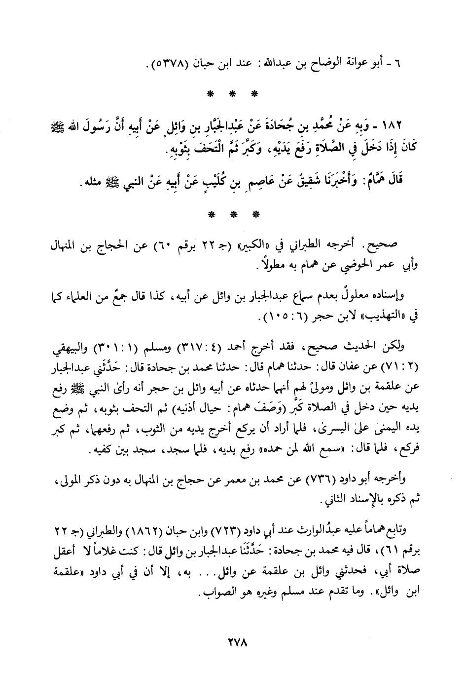 182 - وَبِهِ عَنْ مُحَمَّدِ بْنِ جُحَادَةَ، عَنْ عَبْدِ الْجَبَّارِ بْنِ وَائِلٍ، عَنْ أَبِيهِ، أَنَّ رَسُولَ اللَّهِ صَلَّى اللهُ عَلَيْهِ وَسَلَّمَ كَانَ §إِذَا دَخَلَ فِي الصَّلَاةِ رَفَعَ يَدَيْهِ، وَكَبَّرَ، ثُمَّ الْتَحَفَ بِثَوْبِهِ قَالَ هَمَّامٌ: وَأَخْبَرَنَا شَقِيقٌ عَنْ عَاصِمِ بْنِ كُلَيْبٍ عَنْ أَبِيهِ عَنِ النَّبِيِّ صَلَّى اللهُ عَلَيْهِ وَسَلَّمَ مِثْلَهُ