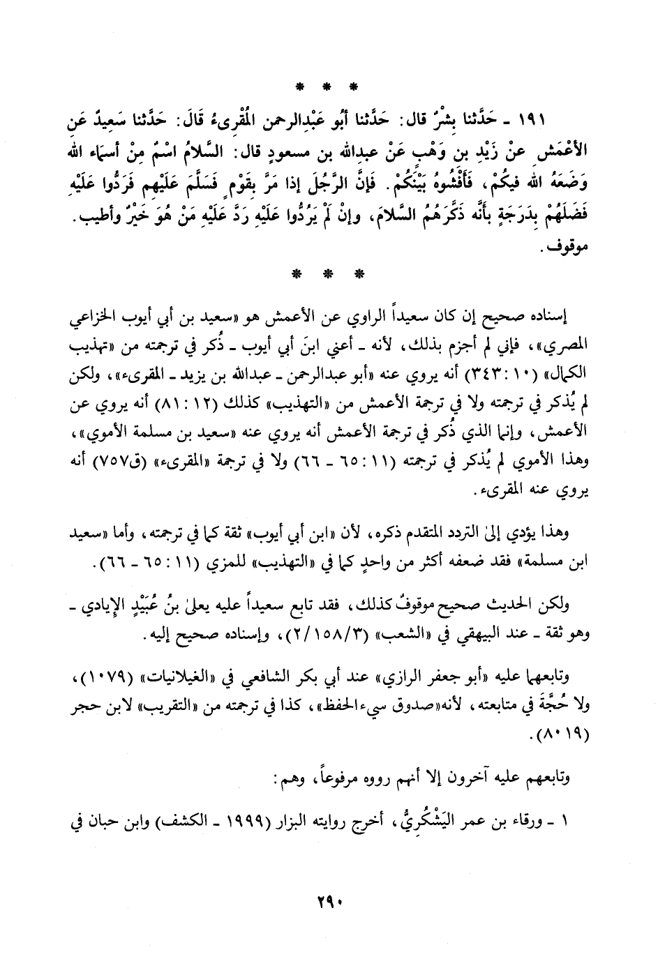 191 - حَدَّثَنَا بِشْرٌ قَالَ: حَدَّثَنَا أَبُو عَبْدِ الرَّحْمَنِ الْمُقْرِئُ قَالَ: حَدَّثَنَا سَعِيدٌ، عَنِ الْأَعْمَشِ، عَنْ زَيْدِ بْنِ وَهْبٍ، عَنْ عَبْدِ اللَّهِ بْنِ مَسْعُودٍ قَالَ: §السَّلَامُ اسْمٌ مِنْ أَسْمَاءِ اللَّهِ وَضَعَهُ اللَّهُ فِيكُمْ فَأَفْشُوهُ بَيْنَكُمْ فَإِنَّ الرَّجُلَ إِذَا مَرَّ بِقَوْمٍ فَسَلَّمَ عَلَيْهِمْ فَرَدُّوا عَلَيْهِ فَضَلَهُمْ بِدَرَجَةٍ بِأَنَّهُ ذَكَّرَهُمُ السَّلَامَ وَإِنْ لَمْ يَرُدُّوا عَلَيْهِ رَدَّ عَلَيْهِ مَنْ هُوَ خَيْرٌ وَأَطْيَبُ مَوْقُوفٌ
