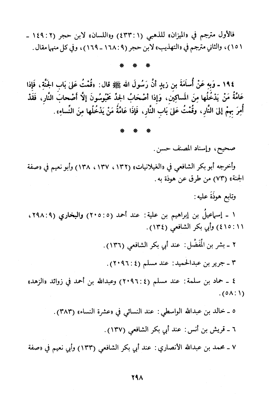 194 - وَبِهِ عَنْ أُسَامَةَ بْنِ زَيْدٍ، أَنَّ رَسُولَ اللَّهِ صَلَّى اللهُ عَلَيْهِ وَسَلَّمَ قَالَ: §" قُمْتُ عَلَى بَابِ الْجَنَّةِ فَإِذَا عَامَّةُ مِنْ يَدْخُلُهَا مِنَ الْمَسَاكِينِ، وَإِذَا أَصْحَابُ الْجَدِّ مَحْبُوسُونَ إِلَّا أَصْحَابُ النَّارِ، فَقَدْ أُمِرَ بِهِمْ إِلَى النَّارِ، وَقُمْتُ عَلَى بَابِ النَّارِ فَإِذَا عَامَّةُ مَنْ يَدْخُلُهَا مِنَ النِّسَاءِ