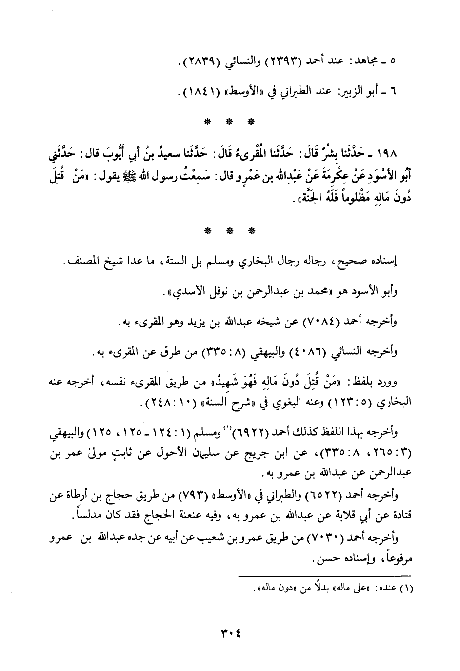 198 - حَدَّثَنَا بِشْرٌ قَالَ: حَدَّثَنَا الْمُقْرِئُ قَالَ: حَدَّثَنَا سَعِيدُ بْنُ أَبِي أَيُّوبَ قَالَ: حَدَّثَنِي أَبُو الْأَسْوَدِ، عَنْ عِكْرِمَةَ، عَنْ عَبْدِ اللَّهِ بْنِ عَمْرٍو قَالَ: سَمِعْتُ رَسُولَ اللَّهِ صَلَّى اللهُ عَلَيْهِ وَسَلَّمَ يَقُولُ: §«مَنْ قُتِلَ دُونَ مَالِهِ مَظْلُومًا فَلَهُ الْجَنَّةُ»