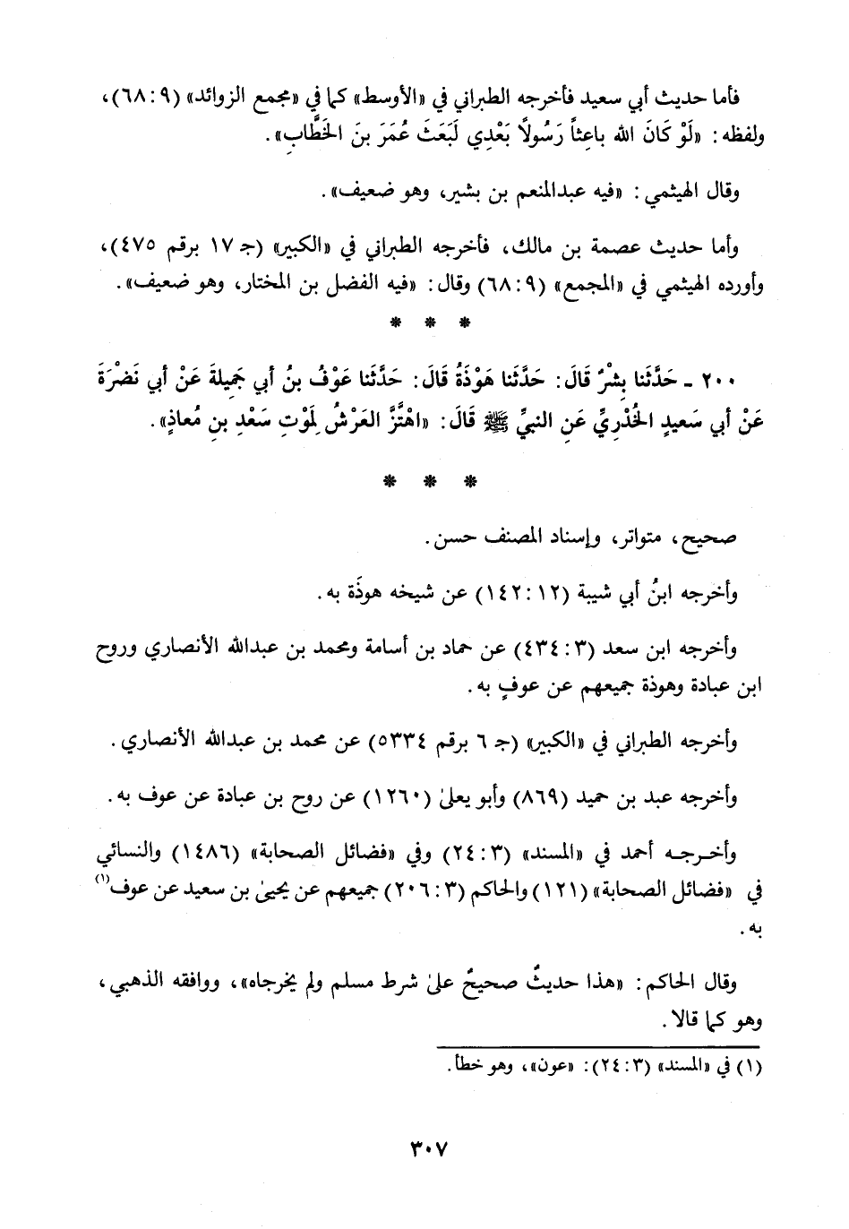 200 - حَدَّثَنَا بِشْرٌ قَالَ: حَدَّثَنَا هَوْذَةُ قَالَ: حَدَّثَنَا عَوْفُ بْنُ أَبِي جَمِيلَةَ، عَنْ أَبِي نَضْرَةَ، عَنْ أَبِي سَعِيدٍ الْخُدْرِيِّ، عَنِ النَّبِيِّ صَلَّى اللهُ عَلَيْهِ وَسَلَّمَ قَالَ: §«اهْتَزَّ الْعَرْشُ لِمَوْتِ سَعْدِ بْنِ مُعَاذٍ»