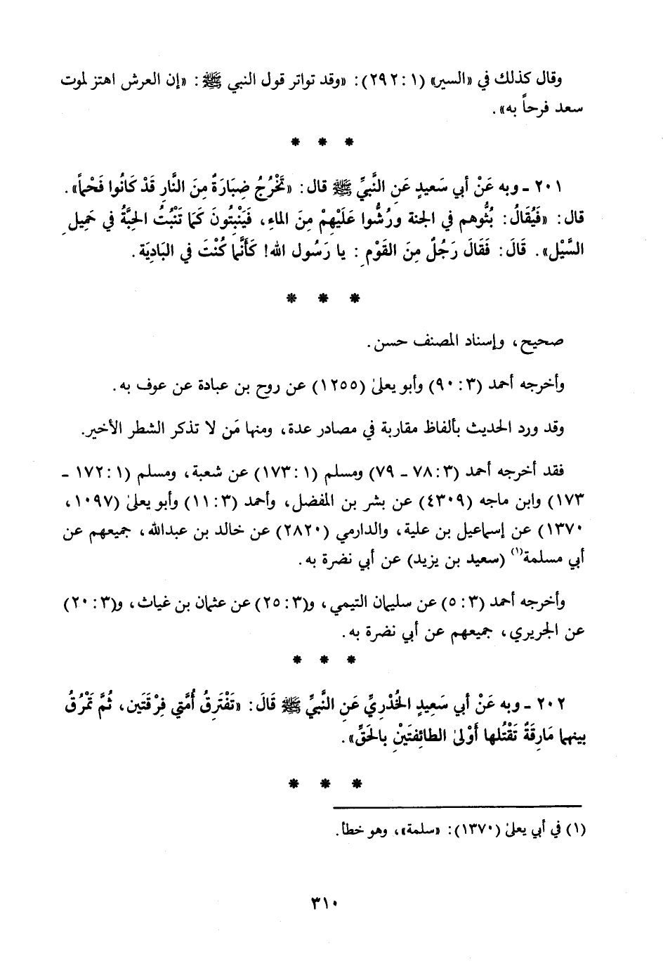201 - وَبِهِ عَنْ أَبِي سَعِيدٍ، عَنِ النَّبِيِّ صَلَّى اللهُ عَلَيْهِ وَسَلَّمَ قَالَ: «§تَخْرُجُ ضِبَارَةٌ مِنَ النَّارِ قَدْ كَانُوا فَحْمًا» قَالَ: «فَيُقَالُ بُثُّوهُمْ فِي الْجَنَّةِ، وَرُشُّوا عَلَيْهِمْ مِنَ الْمَاءِ فَيَنْبُتُونَ كَمَا تَنْبُتُ الْحِبَّةُ فِي حَمِيلِ السَّيْلِ» قَالَ: فَقَالَ رَجُلٌ مِنَ الْقَوْمِ يَا رَسُولَ اللَّهِ كَأَنَّمَا كُنْتَ فِي الْبَادِيَةِ