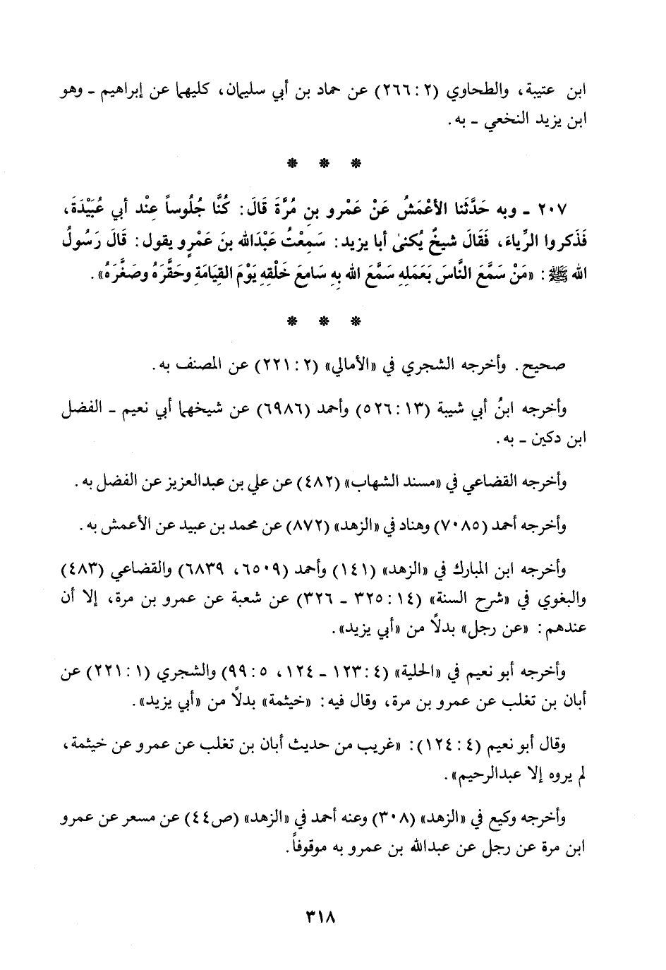 207 - وَبِهِ حَدَّثَنَا الْأَعْمَشُ، عَنْ عَمْرِو بْنِ مُرَّةَ قَالَ: كُنَّا جُلُوسًا عِنْدَ أَبِي عُبَيْدَةَ فَذَكَرُوا الرِّيَاءَ فَقَالَ شَيْخٌ يُكَنَّى أَبَا يَزِيدَ: سَمِعْتُ عَبْدَ اللَّهِ بْنَ عَمْرٍو، يَقُولُ: قَالَ رَسُولُ اللَّهِ صَلَّى اللهُ عَلَيْهِ وَسَلَّمَ: §«مَنْ سَمَّعَ النَّاسَ بِعَمَلِهِ سَمَّعَ اللَّهُ بِهِ سَامِعَ خَلْقِهِ يَوْمَ الْقِيَامَةِ وَحَقَّرَهُ وَصَغَّرَهُ»