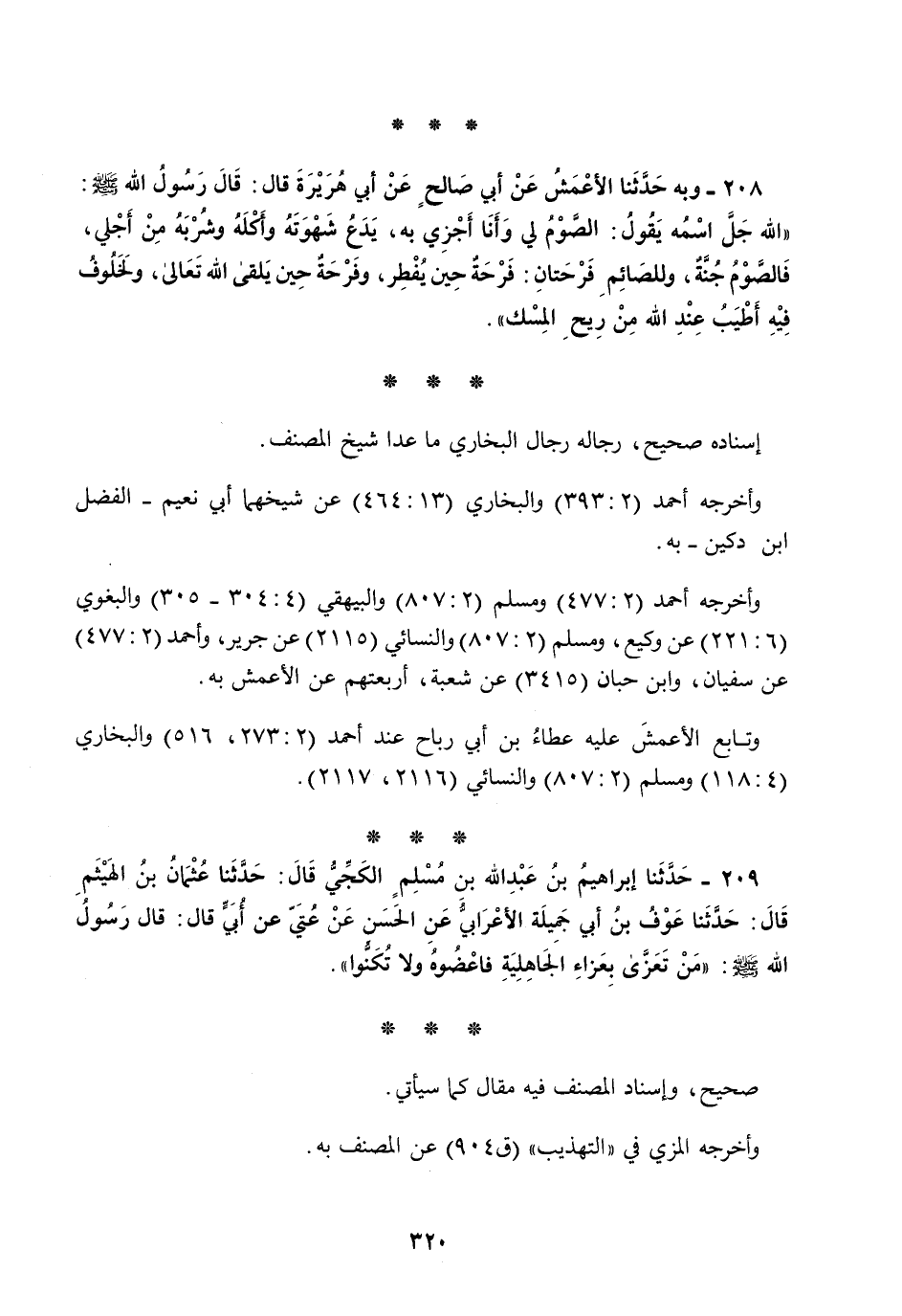 208 - وَبِهِ حَدَّثَنَا الْأَعْمَشُ، عَنْ أَبِي صَالِحٍ، عَنْ أَبِي هُرَيْرَةَ قَالَ: قَالَ رَسُولُ اللَّهِ صَلَّى اللهُ عَلَيْهِ وَسَلَّمَ: " §اللَّهُ جَلَّ اسْمُهُ يَقُولُ: الصَّوْمُ لِي وَأَنَا أَجْزِي بِهِ، يَدَعُ شَهْوَتَهُ وَأَكْلَهُ وَشُرْبَهُ مِنْ أَجْلِي فَالصَّوْمُ جُنَّةٌ، وَلِلصَّائِمِ فَرْحَتَانِ فَرْحَةٌ حِينَ يُفْطِرُ، وَفَرْحَةٌ حِينَ يَلْقَى اللَّهَ تَعَالَى، وَلَخَلُوفُ فِيهِ أَطْيَبُ عِنْدَ اللَّهِ مِنْ رِيحِ الْمِسْكِ "