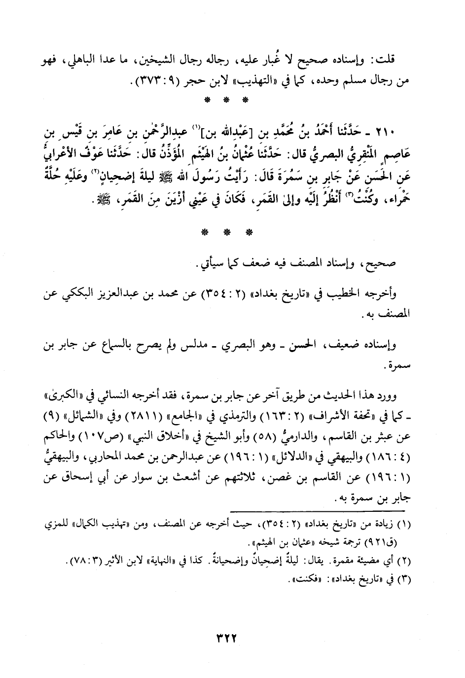 210 - حَدَّثَنَا أَحْمَدُ بْنُ مُحَمَّدِ بْنِ عَبْدِ اللَّهِ بْنِ عَبْدِ الرَّحْمَنِ بْنِ عَامِرِ بْنِ قَيْسِ بْنِ عَاصِمٍ الْمِنْقَرِيُّ الْبَصْرِيُّ قَالَ: حَدَّثَنَا عُثْمَانُ بْنُ الْهَيْثَمِ الْمُؤَذِّنُ قَالَ: حَدَّثَنَا عَوْفٌ الْأَعْرَابِيُّ، عَنِ الْحَسَنِ، عَنْ جَابِرِ بْنِ سَمُرَةَ قَالَ: §رَأَيْتُ رَسُولَ اللَّهِ صَلَّى اللهُ عَلَيْهِ وَسَلَّمَ لَيْلَةَ إِضْحِيَانٍ وَعَلَيْهِ حُلَّةٌ حَمْرَاءُ وَكُنْتُ أَنْظُرُ إِلَيْهِ وَإِلَى الْقَمَرِ فَكَانَ فِي عَيْنِي أَزْيَنَ مِنَ الْقَمَرِ صَلَّى اللهُ عَلَيْهِ وَسَلَّمَ