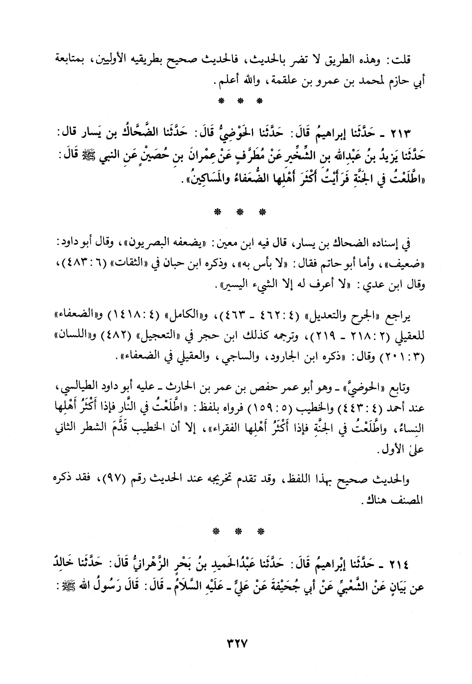 213 - حَدَّثَنَا إِبْرَاهِيمُ قَالَ: حَدَّثَنَا الْحَوْضِيُّ قَالَ: حَدَّثَنَا الضَّحَّاكُ بْنُ يَسَارٍ قَالَ: حَدَّثَنَا يَزِيدُ بْنُ عَبْدِ اللَّهِ بْنِ الشِّخِّيرِ، عَنْ مُطَرِّفٍ، عَنْ عِمْرَانَ بْنِ حُصَيْنٍ، عَنِ النَّبِيِّ صَلَّى اللهُ عَلَيْهِ وَسَلَّمَ قَالَ: §«اطَّلَعْتُ فِي الْجَنَّةِ فَرَأَيْتُ أَكْثَرَ أَهْلِهَا الضُّعَفَاءَ وَالْمَسَاكِينَ»