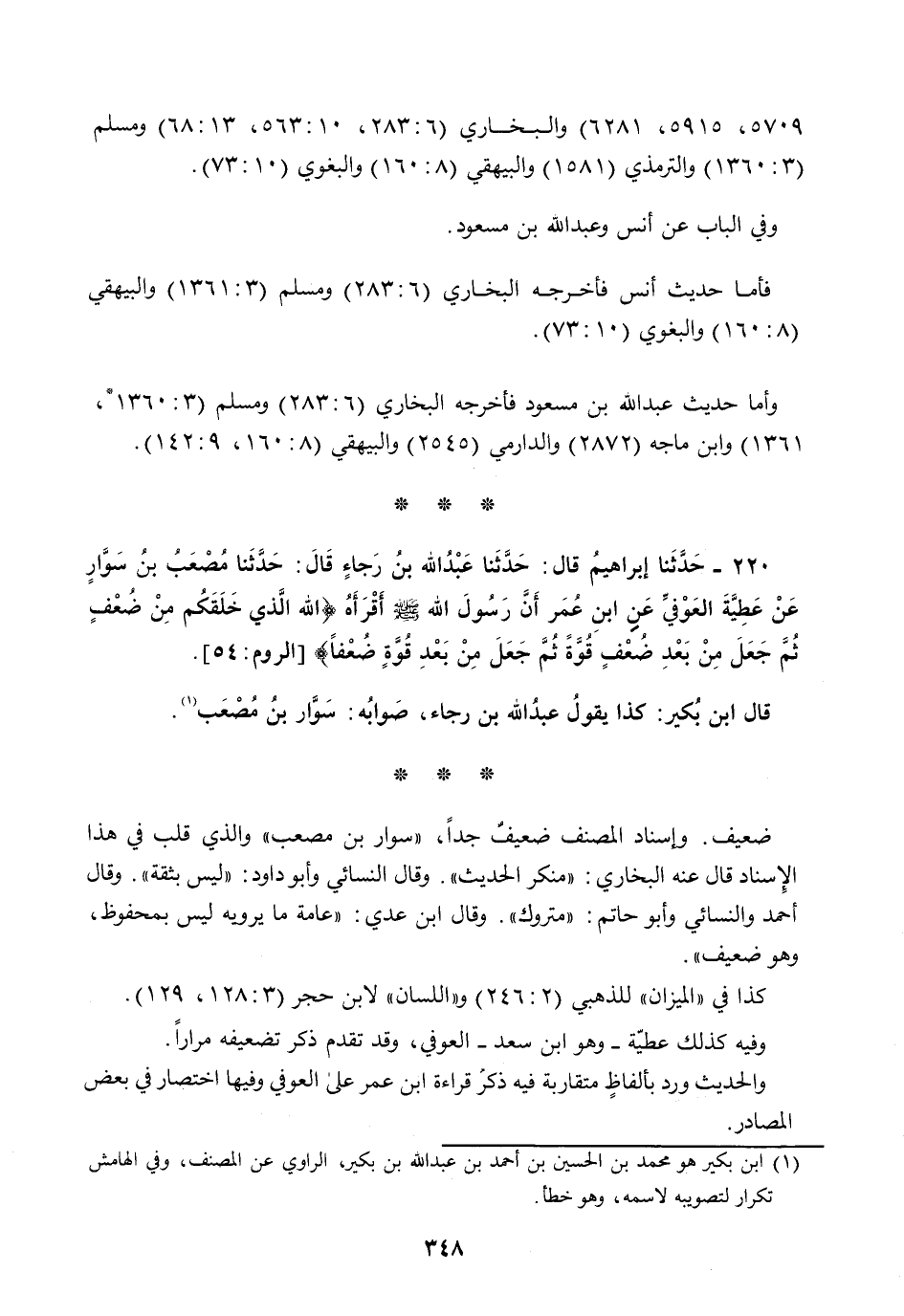 220 - حَدَّثَنَا إِبْرَاهِيمُ قَالَ: حَدَّثَنَا عَبْدُ اللَّهِ بْنُ رَجَاءٍ قَالَ: حَدَّثَنَا مُصْعَبُ بْنُ سَوَّارٍ، عَنْ عَطِيَّةَ الْعَوْفِيِّ، عَنِ ابْنِ عُمَرَ، §أَنَّ رَسُولَ اللَّهِ صَلَّى اللهُ عَلَيْهِ وَسَلَّمَ أَقْرَأَهُ: {اللَّهُ الَّذِي خَلَقَكُمْ مِنْ ضَعْفٍ ثُمَّ جَعَلَ مِنْ بَعْدِ ضَعْفٍ قُوَّةً ثُمَّ جَعَلَ مِنْ بَعْدِ قُوَّةٍ ضَعْفًا} [الروم: 54] . قَالَ ابْنُ بُكَيْرٍ: كَذَا يَقُولُ عَبْدُ اللَّهِ بْنُ رَجَاءٍ صَوَابُهُ سَوَّارُ بْنُ مُصْعَبٍ