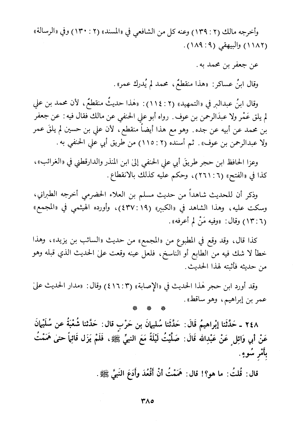 248 - حَدَّثَنَا إِبْرَاهِيمُ قَالَ: حَدَّثَنَا سُلَيْمَانُ بْنُ حَرْبٍ قَالَ: حَدَّثَنَا شُعْبَةُ، عَنْ سُلَيْمَانَ، عَنْ أَبِي وَائِلٍ، عَنْ عَبْدِ اللَّهِ قَالَ: §صَلَّيْتُ لَيْلَةً مَعَ النَّبِيِّ صَلَّى اللهُ عَلَيْهِ وَسَلَّمَ فَلَمْ يَزَلْ قَائِمًا حَتَّى هَمَمْتُ بِأَمْرِ سُوءٍ قَالَ: قُلْتُ: مَا هُوَ؟ قَالَ: هَمَمْتُ أَنْ أَقْعُدَ وَأَدَعَ النَّبِيَّ صَلَّى اللهُ عَلَيْهِ وَسَلَّمَ