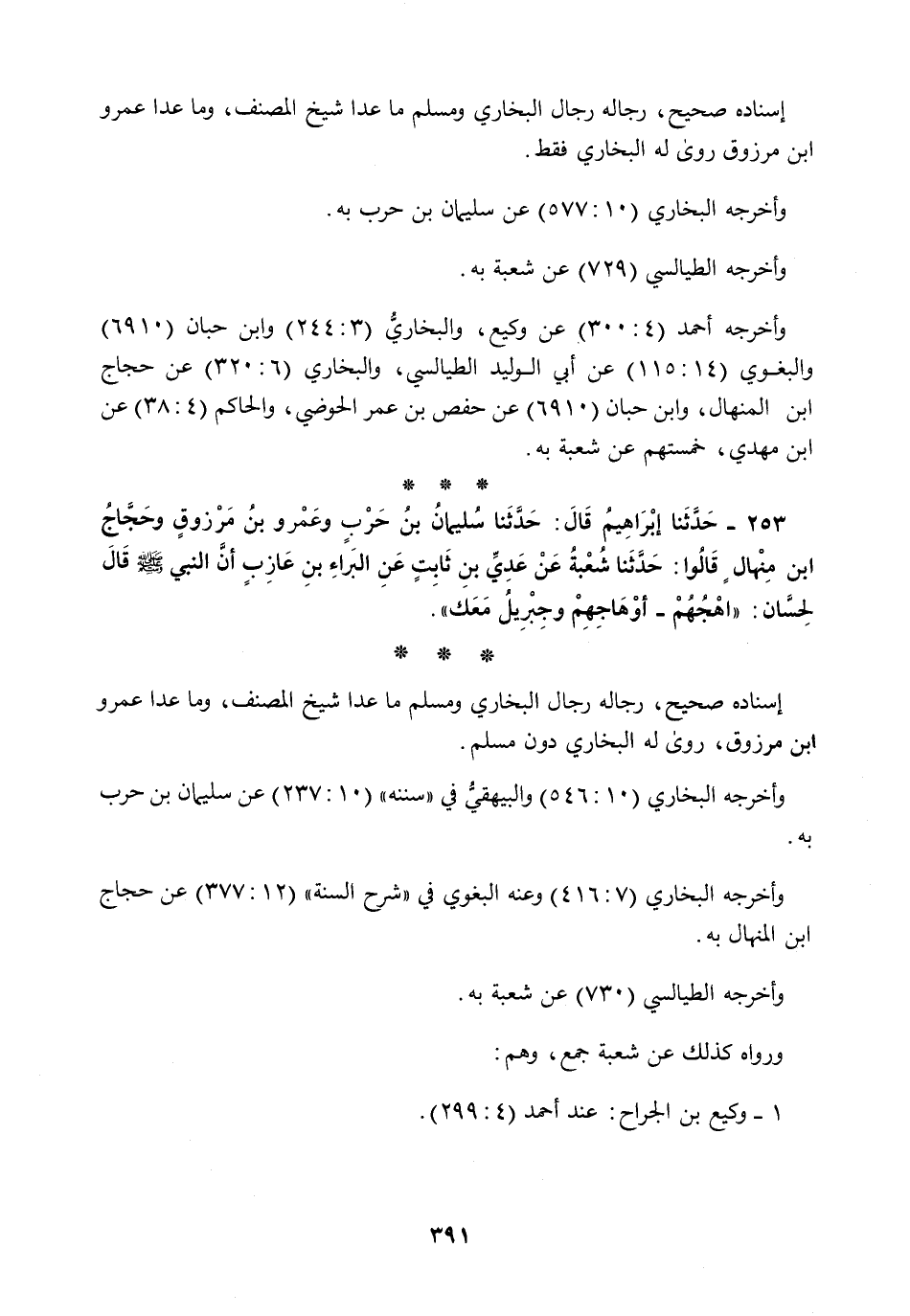 253 - حَدَّثَنَا إِبْرَاهِيمُ قَالَ: حَدَّثَنَا سُلَيْمَانُ بْنُ حَرْبٍ، وَعَمْرُو بْنُ مَرْزُوقٍ، وَحَجَّاجُ بْنُ مِنْهَالٍ، قَالُوا: حَدَّثَنَا شُعْبَةُ، عَنْ عَدِيِّ بْنِ ثَابِتٍ، عَنِ الْبَرَاءِ بْنِ عَازِبٍ، أَنَّ النَّبِيَّ صَلَّى اللهُ عَلَيْهِ وَسَلَّمَ قَالَ لِحَسَّانَ: §«اهْجُهُمْ أَوْهَاجِهِمْ وَجِبْرِيلُ مَعَكَ»