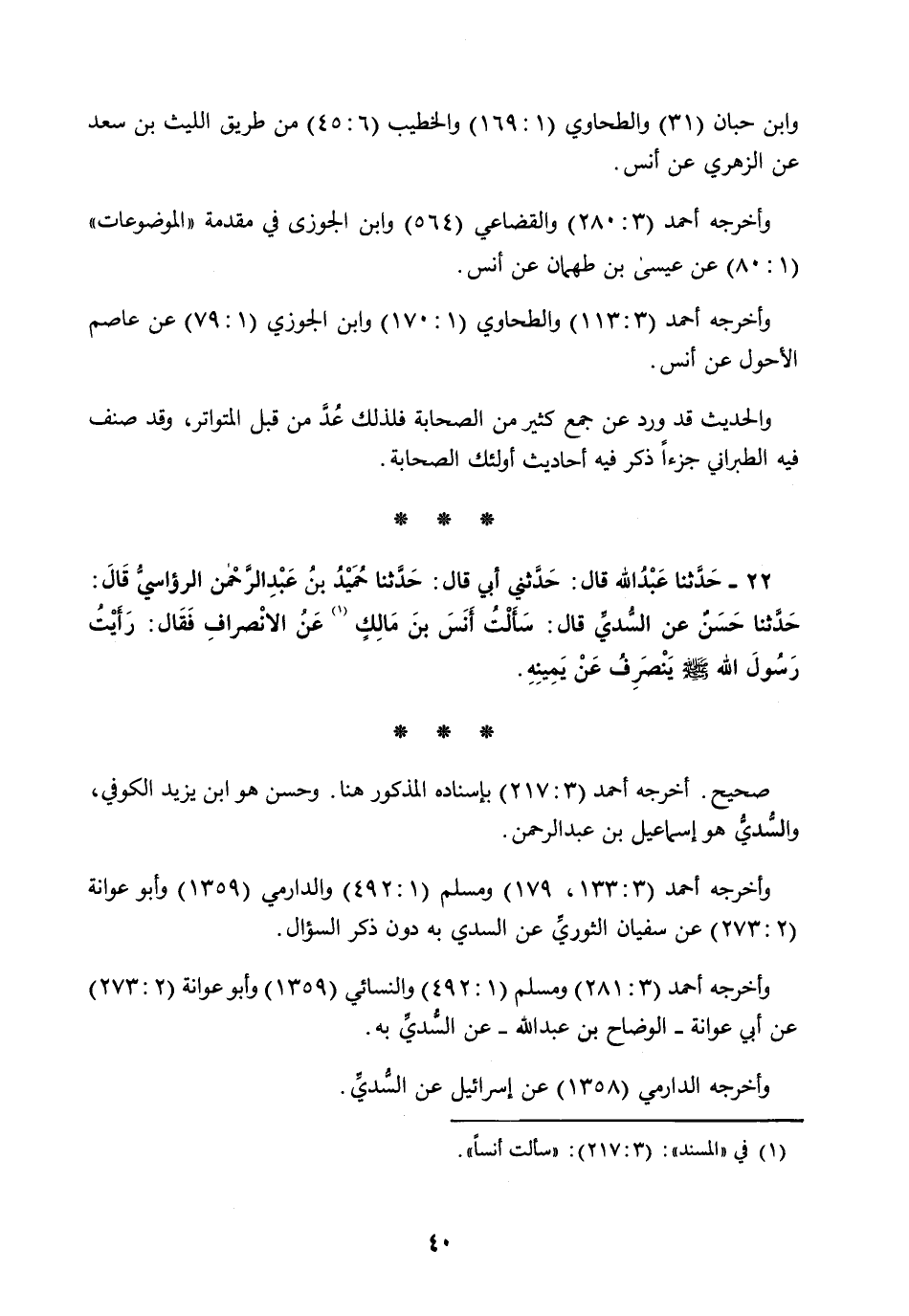 22 - حَدَّثَنَا عَبْدُ اللَّهِ قَالَ: حَدَّثَنِي أَبِي قَالَ،: حَدَّثَنَا حُمَيْدُ بْنُ عَبْدِ الرَّحْمَنِ الرُّؤَاسِيُّ: قَالَ: حَدَّثَنَا حَسَنٌ، عَنِ السُّدِّيِّ قَالَ: سَأَلْتُ أَنَسَ بْنَ مَالِكٍ عَنِ الِانْصِرَافِ، فَقَالَ: §رَأَيْتُ رَسُولَ اللَّهِ صَلَّى اللهُ عَلَيْهِ وَسَلَّمَ يَنْصَرِفُ عَنْ يَمِينِهِ
