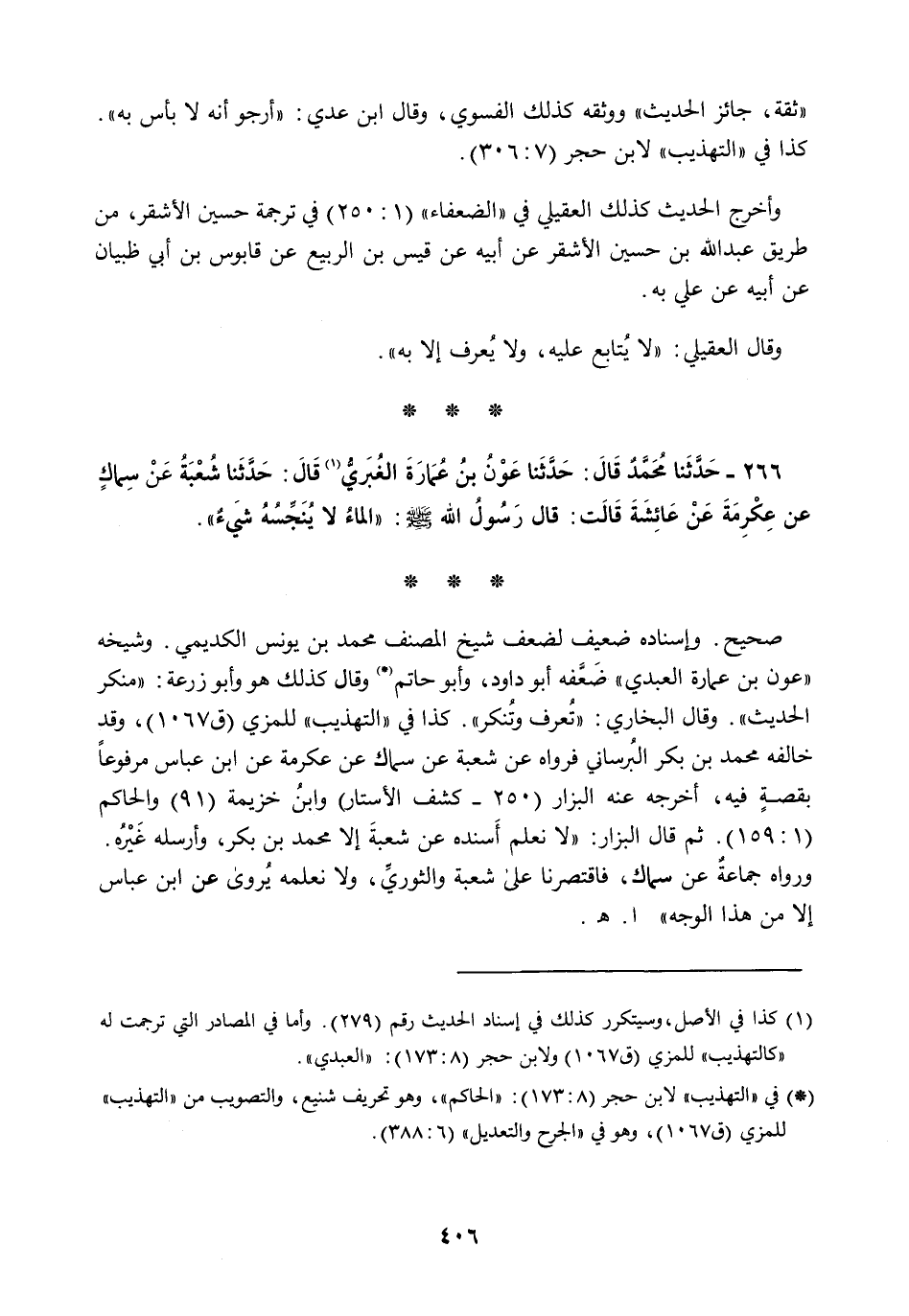 266 - حَدَّثَنَا مُحَمَّدٌ قَالَ: حَدَّثَنَا عَوْنُ بْنُ عُمَارَةَ الْعَبْدِيُّ قَالَ: حَدَّثَنَا شُعْبَةُ، عَنْ سِمَاكٍ، عَنْ عِكْرِمَةَ، عَنْ عَائِشَةَ قَالَتْ: قَالَ رَسُولُ اللَّهِ صَلَّى اللهُ عَلَيْهِ وَسَلَّمَ: §«الْمَاءُ لَا يُنَجِّسُهُ شَيْءٌ»
