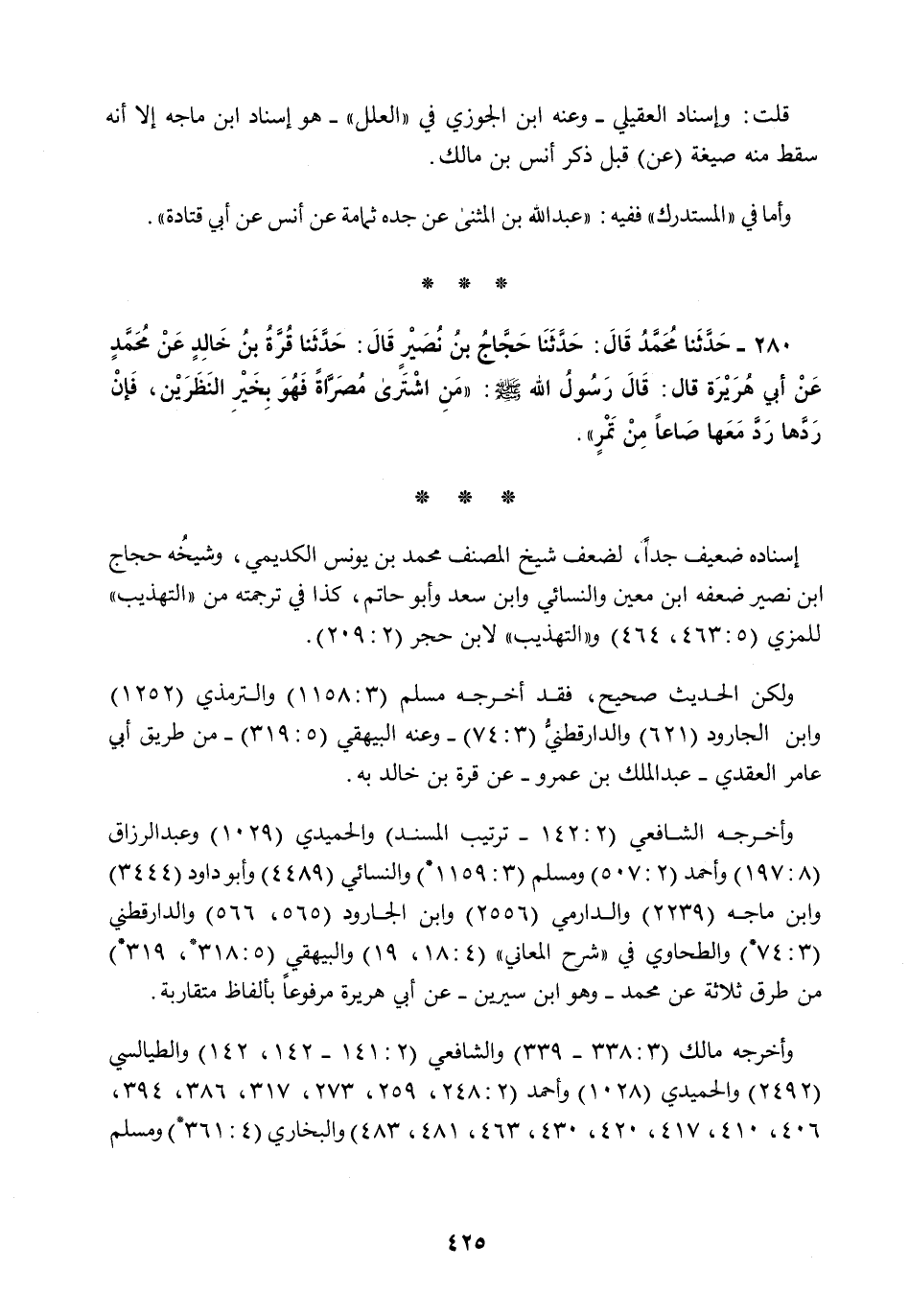 280 - حَدَّثَنَا مُحَمَّدٌ قَالَ: حَدَّثَنَا حَجَّاجُ بْنُ نُصَيْرٍ قَالَ: حَدَّثَنَا قُرَّةُ بْنُ خَالِدٍ، عَنْ مُحَمَّدٍ، عَنْ أَبِي هُرَيْرَةَ قَالَ: قَالَ رَسُولُ اللَّهِ صَلَّى اللهُ عَلَيْهِ وَسَلَّمَ: §«مَنِ اشْتَرَى مُصَرَّاةً فَهُوَ بِخَيْرِ النَّظَرَيْنِ فَإِنْ رَدَّهَا رَدَّ مَعَهَا صَاعًا مِنْ تَمْرٍ»