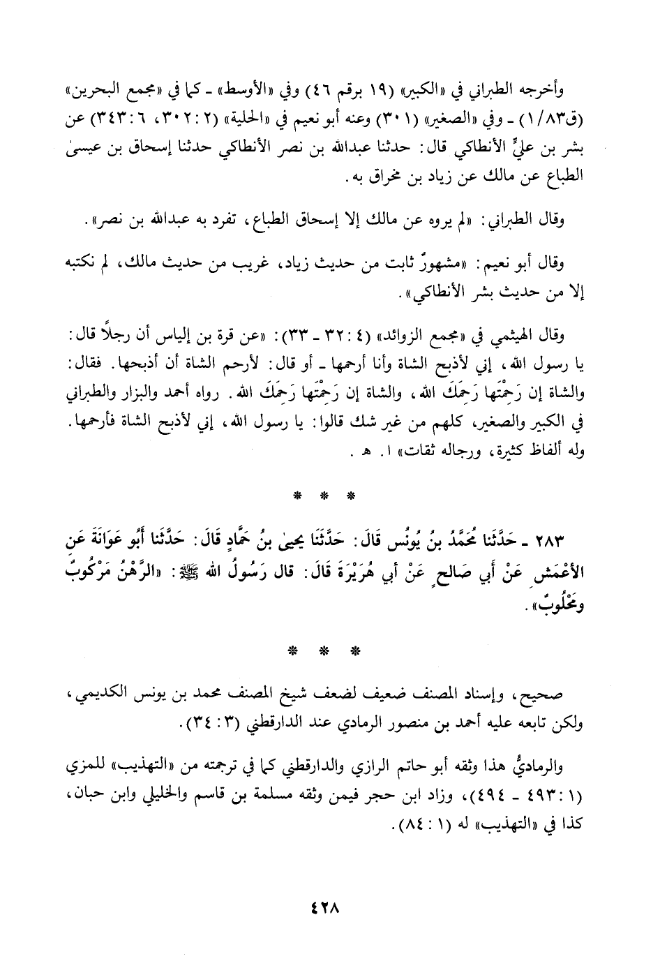 283 - حَدَّثَنَا مُحَمَّدُ بْنُ يُونُسَ قَالَ: حَدَّثَنَا يَحْيَى بْنُ حَمَّادٍ قَالَ: حَدَّثَنَا أَبُو عَوَانَةَ، عَنِ الْأَعْمَشِ، عَنْ أَبِي صَالِحٍ، عَنْ أَبِي هُرَيْرَةَ قَالَ: قَالَ رَسُولُ اللَّهِ صَلَّى اللهُ عَلَيْهِ وَسَلَّمَ: §«الرَّهْنُ مَرْكُوبٌ وَمَحْلُوبٌ»