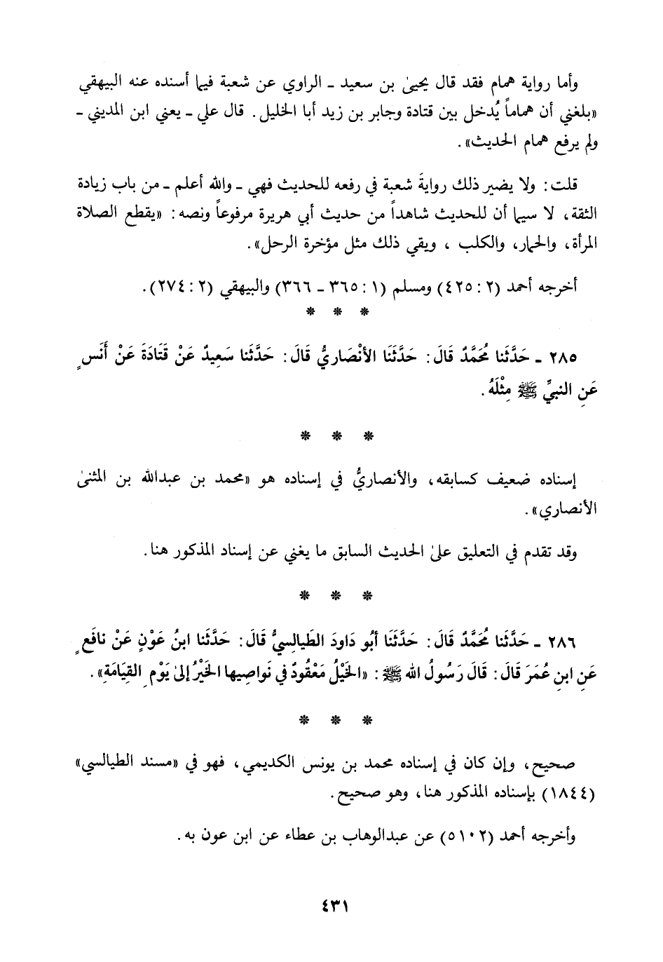 286 - حَدَّثَنَا مُحَمَّدٌ قَالَ: حَدَّثَنَا أَبُو دَاوُدَ الطَّيَالِسِيُّ قَالَ: حَدَّثَنَا ابْنُ عَوْنٍ، عَنْ نَافِعٍ، عَنِ ابْنِ عُمَرَ قَالَ: قَالَ رَسُولُ اللَّهِ صَلَّى اللهُ عَلَيْهِ وَسَلَّمَ: §«الْخَيْلُ مَعْقُودٌ فِي نَوَاصِيهَا الْخَيْرُ إِلَى يَوْمِ الْقِيَامَةِ»