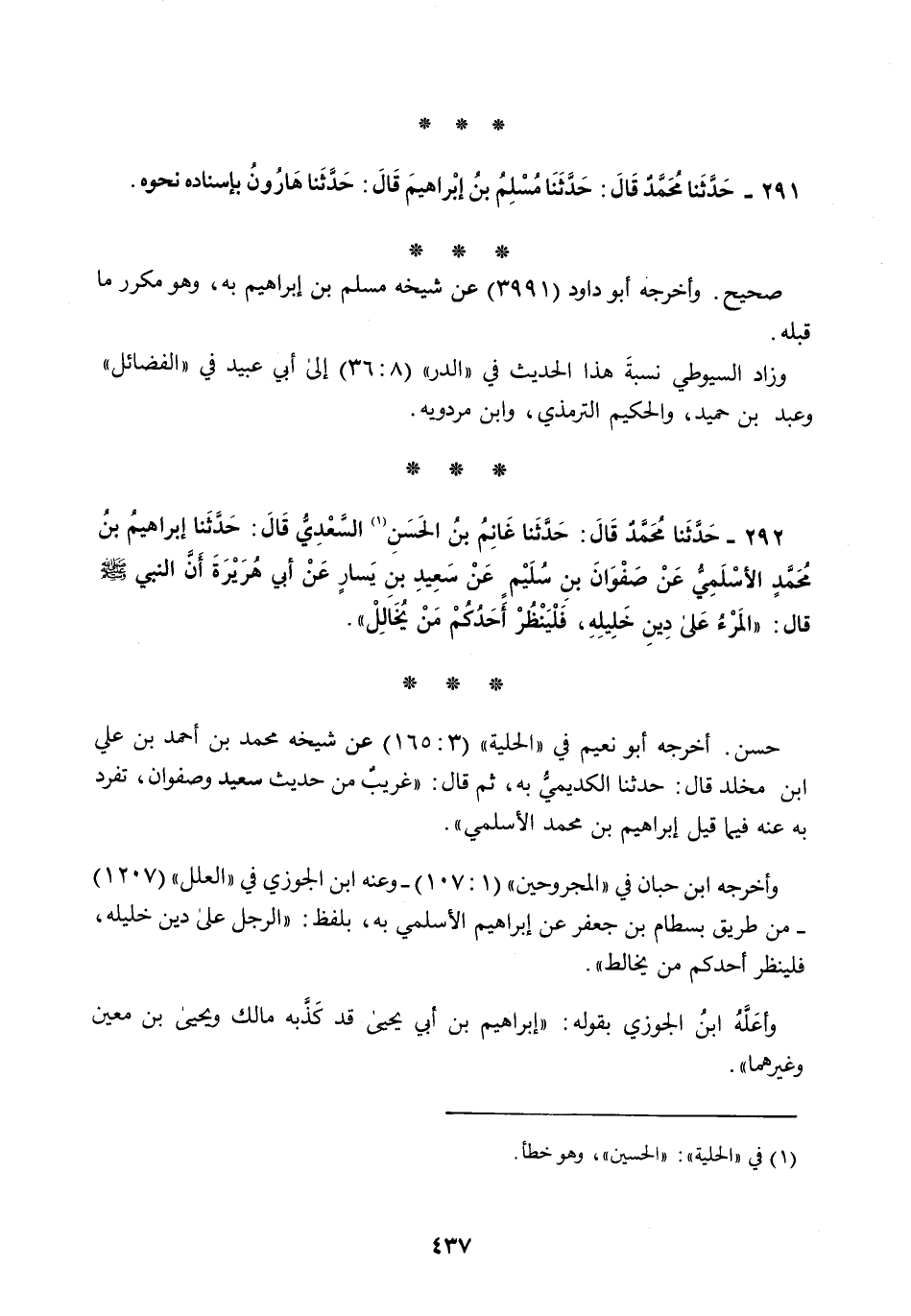 292 - حَدَّثَنَا مُحَمَّدٌ قَالَ: حَدَّثَنَا غَانِمُ بْنُ الْحَسَنِ السَّعْدِيُّ قَالَ: حَدَّثَنَا إِبْرَاهِيمُ بْنُ مُحَمَّدٍ الْأَسْلَمِيُّ، عَنْ صَفْوَانَ بْنِ سُلَيْمٍ، عَنْ سَعِيدِ بْنِ يَسَارٍ، عَنْ أَبِي هُرَيْرَةَ، أَنَّ النَّبِيَّ صَلَّى اللهُ عَلَيْهِ وَسَلَّمَ قَالَ: §«الْمَرْءُ عَلَى دِينِ خَلِيلِهِ فَلْيَنْظُرْ أَحَدُكُمْ مَنْ يُخَالِلْ»