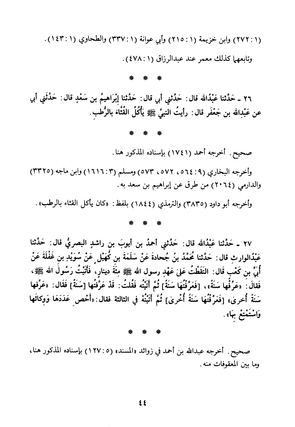 26 - حَدَّثَنَا عَبْدُ اللَّهِ قَالَ: حَدَّثَنِي أَبِي قَالَ،: حَدَّثَنَا إِبْرَاهِيمُ بْنُ سَعْدٍ قَالَ: حَدَّثَنِي أَبِي، عَنْ عَبْدِ اللَّهِ بْنِ جَعْفَرٍ قَالَ: رَأَيْتُ النَّبِيَّ §يَأْكُلُ الْقِثَّاءَ بِالرُّطَبِ