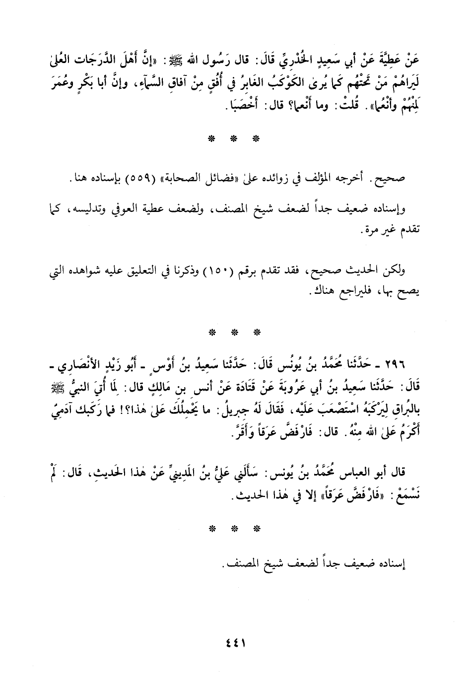 296 - حَدَّثَنَا مُحَمَّدُ بْنُ يُونُسَ قَالَ: حَدَّثَنَا سَعِيدُ بْنُ أَوْسٍ أَبُو زَيْدٍ الْأَنْصَارِيُّ قَالَ: حَدَّثَنَا سَعِيدُ بْنُ أَبِي عَرُوبَةَ، عَنْ قَتَادَةَ، عَنْ أَنَسِ بْنِ مَالِكٍ قَالَ: §لَمَّا أُتِيَ النَّبِيُّ صَلَّى اللهُ عَلَيْهِ وَسَلَّمَ بِالْبُرَاقِ لِيَرْكَبَهُ اسْتُصْعِبَ عَلَيْهِ فَقَالَ لَهُ جِبْرِيلُ: مَا يَحْمِلُكَ عَلَى هَذَا؟ فَمَا رَكِبَكَ آدَمَيُّ أَكْرَمُ عَلَى اللَّهِ مِنْهُ قَالَ: فَارْفَضَّ عَرَقًا، وَأَقَرَّ قَالَ أَبُو الْعَبَّاسِ مُحَمَّدُ بْنُ يُونُسَ: سَأَلَنِي عَلِيُّ بْنُ الْمَدِينِيِّ عَنْ هَذَا الْحَدِيثِ قَالَ: لَمْ نَسْمَعْ فَارْفَضَّ عَرَقًا إِلَّا فِي هَذَا الْحَدِيثِ