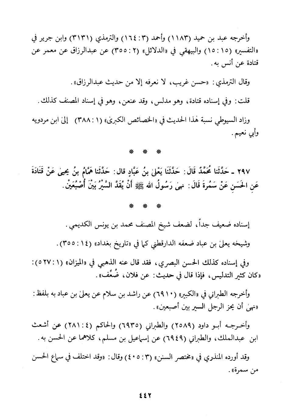 297 - حَدَّثَنَا مُحَمَّدٌ قَالَ: حَدَّثَنَا يَعْلَى بْنُ عَبَّادٍ قَالَ: حَدَّثَنَا هَمَّامُ بْنُ يَحْيَى، عَنْ قَتَادَةَ، عَنِ الْحَسَنِ، عَنْ سَمُرَةَ قَالَ: §«نَهَى رَسُولُ اللَّهِ صَلَّى اللهُ عَلَيْهِ وَسَلَّمَ أَنْ يُقَدَّ السَّيْرُ بَيْنَ أَصْبُعَيْنِ»