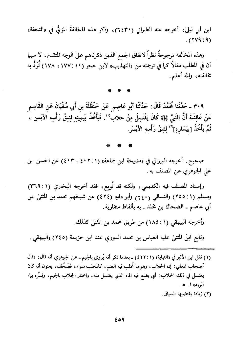 309 - حَدَّثَنَا مُحَمَّدٌ قَالَ: حَدَّثَنَا أَبُو عَاصِمٍ، عَنْ حَنْظَلَةَ بْنِ أَبِي سُفْيَانَ، عَنِ الْقَاسِمِ، عَنْ عَائِشَةَ، أَنَّ النَّبِيَّ صَلَّى اللهُ عَلَيْهِ وَسَلَّمَ §كَانَ يَغْتَسِلُ مِنْ حِلَابٍ فَيَأْخُذُ بِيَمِينِهِ لِشِقِّ رَأْسِهِ الْأَيْمَنَ، ثُمَّ يَأْخُذُ بِيَسَارِهِ لِشِقِّ رَأْسِهِ الْأَيْسَرِ "