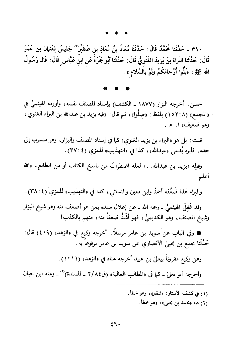 310 - حَدَّثَنَا مُحَمَّدٌ قَالَ: حَدَّثَنَا مُعَاذُ بْنُ مُعَاذِ بْنِ صُقَيْرٍ، جَلِيسٌ لِعُثْمَانَ بْنِ عُمَرَ قَالَ: حَدَّثَنَا الْبَرَاءُ بْنُ يَزِيدَ الْغَنَوِيُّ قَالَ: حَدَّثَنَا أَبُو جَمْرَةَ، عَنِ ابْنِ عَبَّاسٍ قَالَ: قَالَ رَسُولُ اللَّهِ صَلَّى اللهُ عَلَيْهِ وَسَلَّمَ: §«بُلُّوا أَرْحَامَكُمْ وَلَوْ بِالسَّلَامِ»