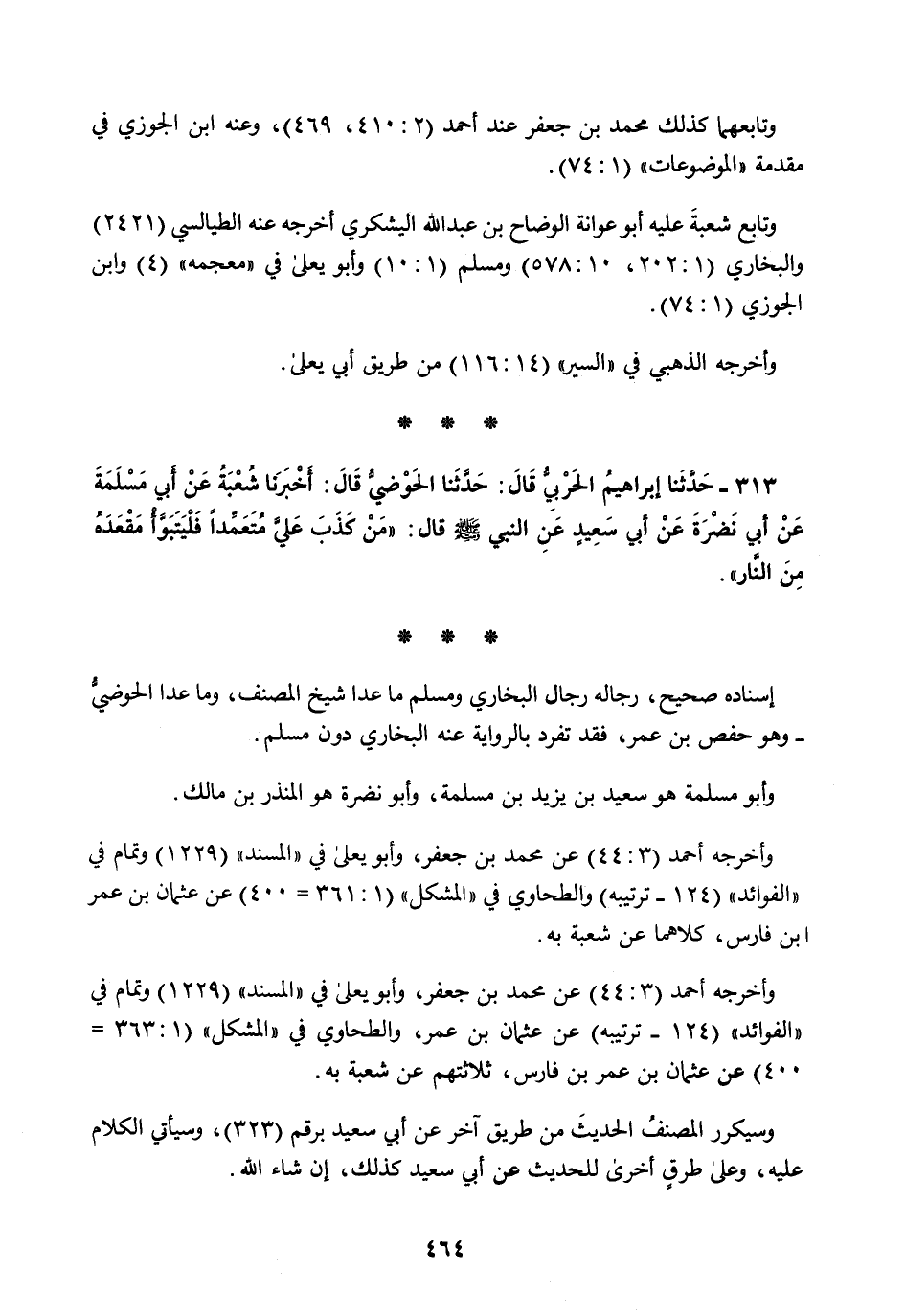 313 - حَدَّثَنَا إِبْرَاهِيمُ الْحَرْبِيُّ قَالَ: حَدَّثَنَا الْحَوْضِيُّ قَالَ: أَخْبَرَنَا شُعْبَةُ، عَنْ أَبِي مَسْلَمَةَ، عَنْ أَبِي نَضْرَةَ، عَنْ أَبِي سَعِيدٍ، عَنِ النَّبِيِّ صَلَّى اللهُ عَلَيْهِ وَسَلَّمَ قَالَ: §«مَنْ كَذَبَ عَلَيَّ مُتَعَمِّدًا فَلْيَتَبَوَّأْ مَقْعَدَهُ مِنَ النَّارِ»