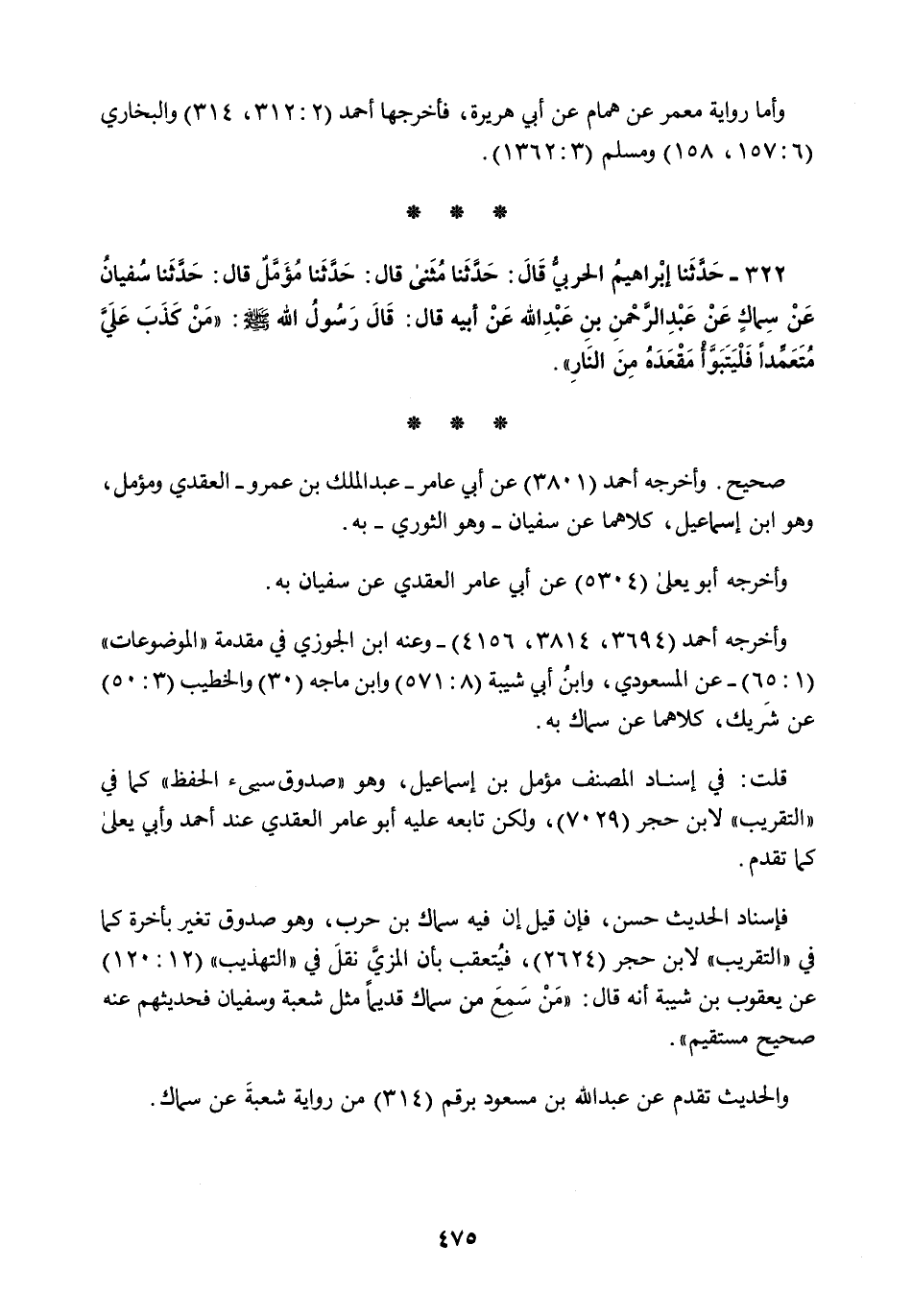 322 - حَدَّثَنَا إِبْرَاهِيمُ الْحَرْبِيُّ قَالَ: حَدَّثَنَا مُثَنَّى قَالَ: حَدَّثَنَا مُؤَمَّلٌ قَالَ: حَدَّثَنَا سُفْيَانُ، عَنْ سِمَاكٍ، عَنْ عَبْدِ الرَّحْمَنِ بْنِ عَبْدِ اللَّهِ، عَنْ أَبِيهِ قَالَ: قَالَ رَسُولُ اللَّهِ صَلَّى اللهُ عَلَيْهِ وَسَلَّمَ: §«مَنْ كَذَبَ عَلَيَّ مُتَعَمِّدًا فَلْيَتَبَوَّأْ مَقْعَدَهُ مِنَ النَّارِ»