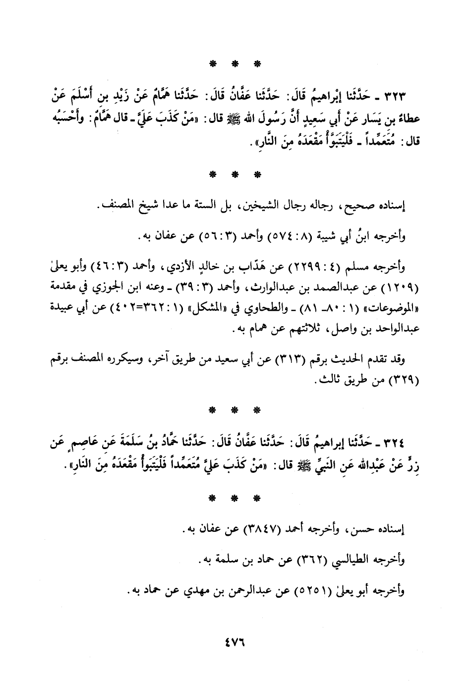 324 - حَدَّثَنَا إِبْرَاهِيمُ قَالَ: حَدَّثَنَا عَفَّانُ قَالَ: حَدَّثَنَا حَمَّادُ بْنُ سَلَمَةَ، عَنْ عَاصِمٍ، عَنْ زِرٍّ، عَنْ عَبْدِ اللَّهِ، عَنِ النَّبِيِّ صَلَّى اللهُ عَلَيْهِ وَسَلَّمَ قَالَ: §«مَنْ كَذَبَ عَلَيَّ مُتَعَمِّدًا فَلْيَتَبَوَّأْ مَقْعَدَهُ مِنَ النَّارِ»