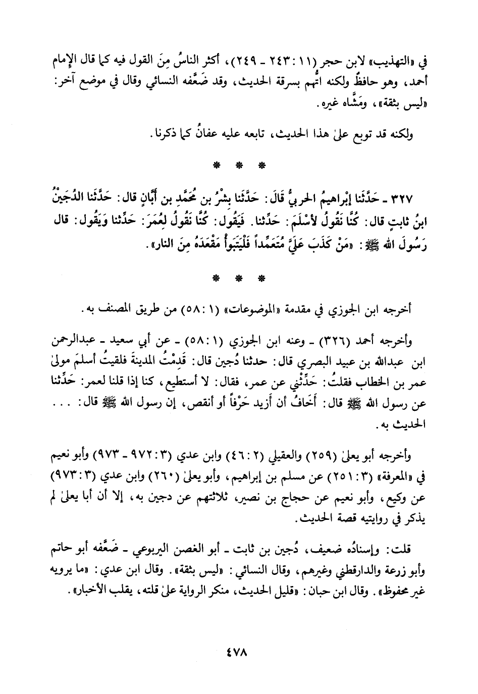 327 - حَدَّثَنَا إِبْرَاهِيمُ الْحَرْبِيُّ قَالَ: حَدَّثَنَا بِشْرُ بْنُ مُحَمَّدِ بْنِ أَبَانَ قَالَ: حَدَّثَنَا الدُّجَيْنُ بْنُ ثَابِتٍ قَالَ: كُنَّا نَقُولُ لِأَسْلَمَ: حَدِّثْنَا فَيَقُولُ،: كُنَّا نَقُولُ لِعُمَرَ حَدِّثْنَا وَيَقُولُ،: قَالَ رَسُولُ اللَّهِ صَلَّى اللهُ عَلَيْهِ وَسَلَّمَ: §«مَنْ كَذَبَ عَلَيَّ مُتَعَمِّدًا فَلْيَتَبَوَّأْ مَقْعَدَهُ مِنَ النَّارِ»