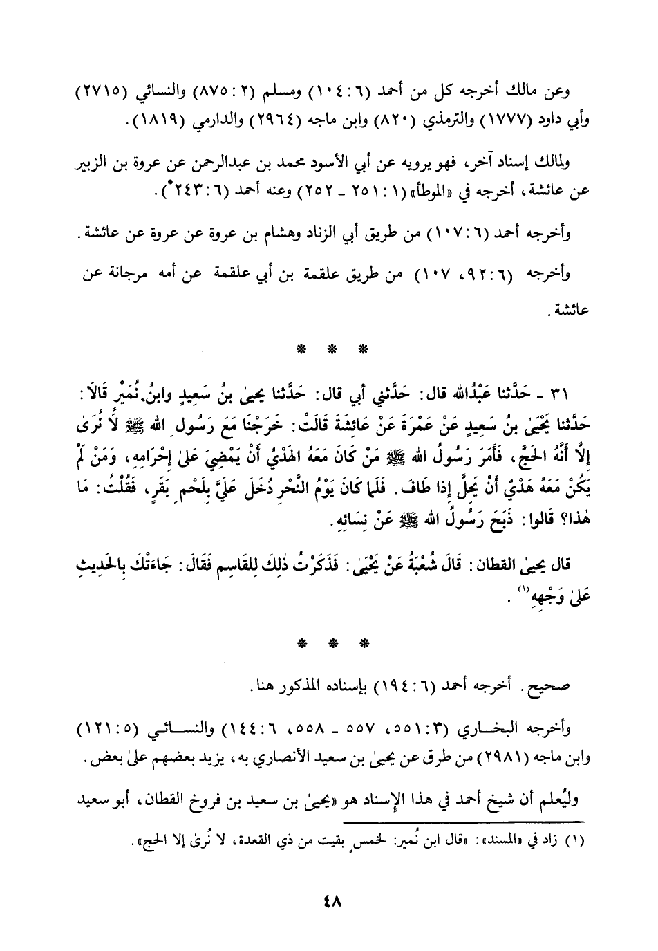 31 - حَدَّثَنَا عَبْدُ اللَّهِ قَالَ: حَدَّثَنِي أَبِي قَالَ: حَدَّثَنَا يَحْيَى بْنُ سَعِيدٍ، وَابْنُ نُمَيْرٍ قَالَا: حَدَّثَنَا يَحْيَى بْنُ سَعِيدٍ، عَنْ عَمْرَةَ، عَنْ عَائِشَةَ قَالَتْ: §خَرَجْنَا مَعَ رَسُولِ اللَّهِ صَلَّى اللهُ عَلَيْهِ وَسَلَّمَ لَا نَرَى إِلَّا أَنَّهُ الْحَجُّ، فَأَمَرَ رَسُولُ اللَّهِ صَلَّى اللهُ عَلَيْهِ وَسَلَّمَ مَنْ كَانَ مَعَهُ الْهَدْي أَنْ يَمْضِيَ عَلَى إِحْرَامِهِ، وَمَنْ لَمْ يَكُنْ مَعَهُ هَدْي أَنْ يَحِلَّ إِذَا طَافَ، فَلَمَّا كَانَ يَوْمُ النَّحْرِ دُخِلَ عَلَيَّ بِلَحْمِ بَقَرٍ، فَقُلْتُ: مَا هَذَا؟ قَالُوا: ذَبَحَ رَسُولُ اللَّهِ عَنْ نِسَائِهِ، قَالَ يَحْيَى الْقَطَّانُ: قَالَ شُعْبَةُ عَنْ يَحْيَى: فَذَكَرْتُ ذَلِكَ لِلْقَاسِمِ فَقَالَ: جَاءَتْكَ بِالْحَدِيثِ عَلَى وَجْهِهِ