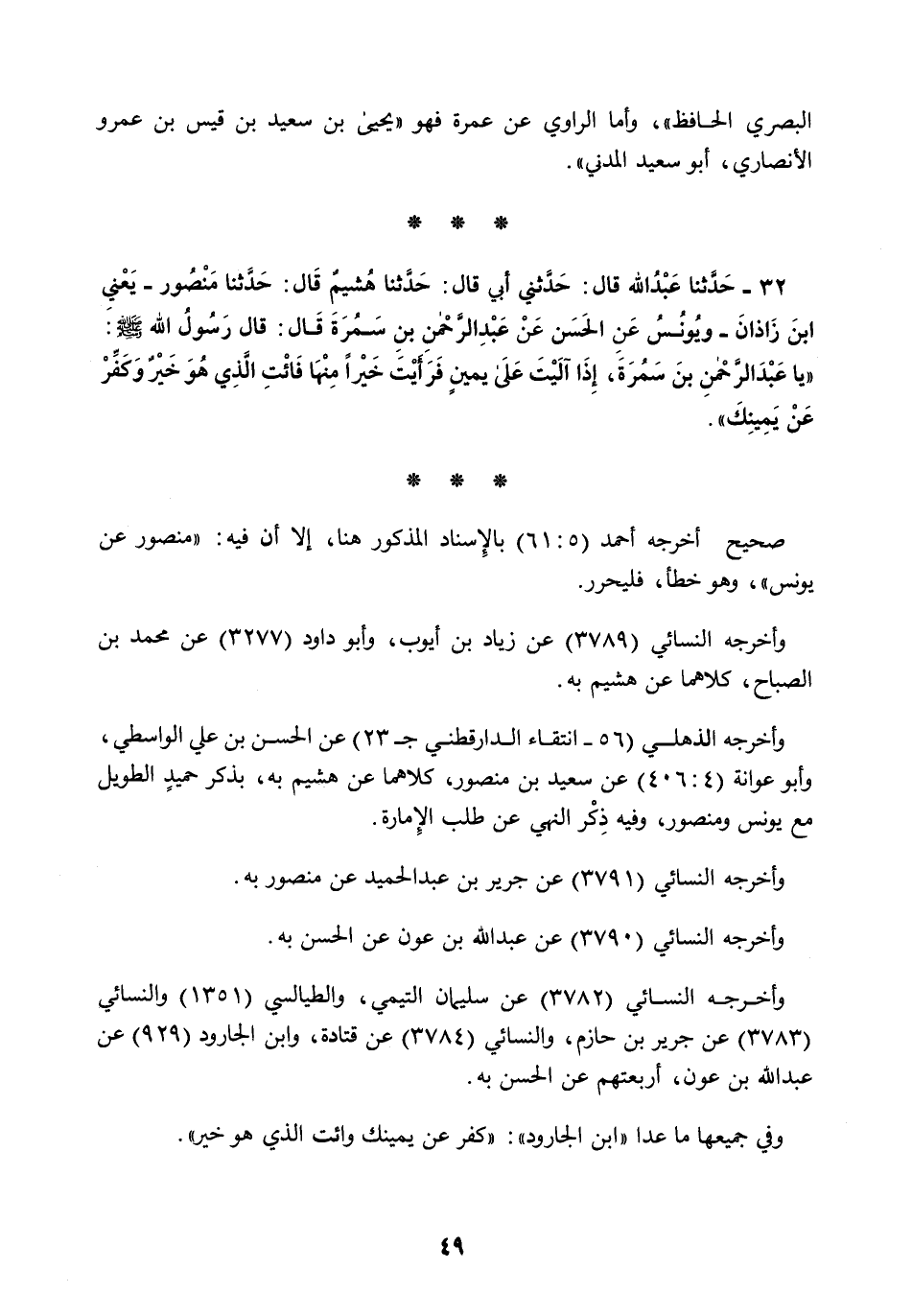 32 - حَدَّثَنَا عَبْدُ اللَّهِ قَالَ: حَدَّثَنِي أَبِي قَالَ: حَدَّثَنَا هُشَيْمٌ قَالَ: حَدَّثَنَا مَنْصُورٌ يَعْنِي ابْنَ زَاذَانَ، وَيُونُسُ، عَنِ الْحَسَنِ، عَنْ عَبْدِ الرَّحْمَنِ بْنِ سَمُرَةَ قَالَ: قَالَ رَسُولُ اللَّهِ صَلَّى اللهُ عَلَيْهِ وَسَلَّمَ: «يَا عَبْدَ الرَّحْمَنِ بْنَ سَمُرَةَ §إِذَا آلَيْتَ عَلَى يَمِينٍ فَرَأَيْتَ خَيْرًا مِنْهَا فَائْتِ الَّذِي هُوَ خَيْرٌ وَكَفِّرْ عَنْ يَمِينِكَ»