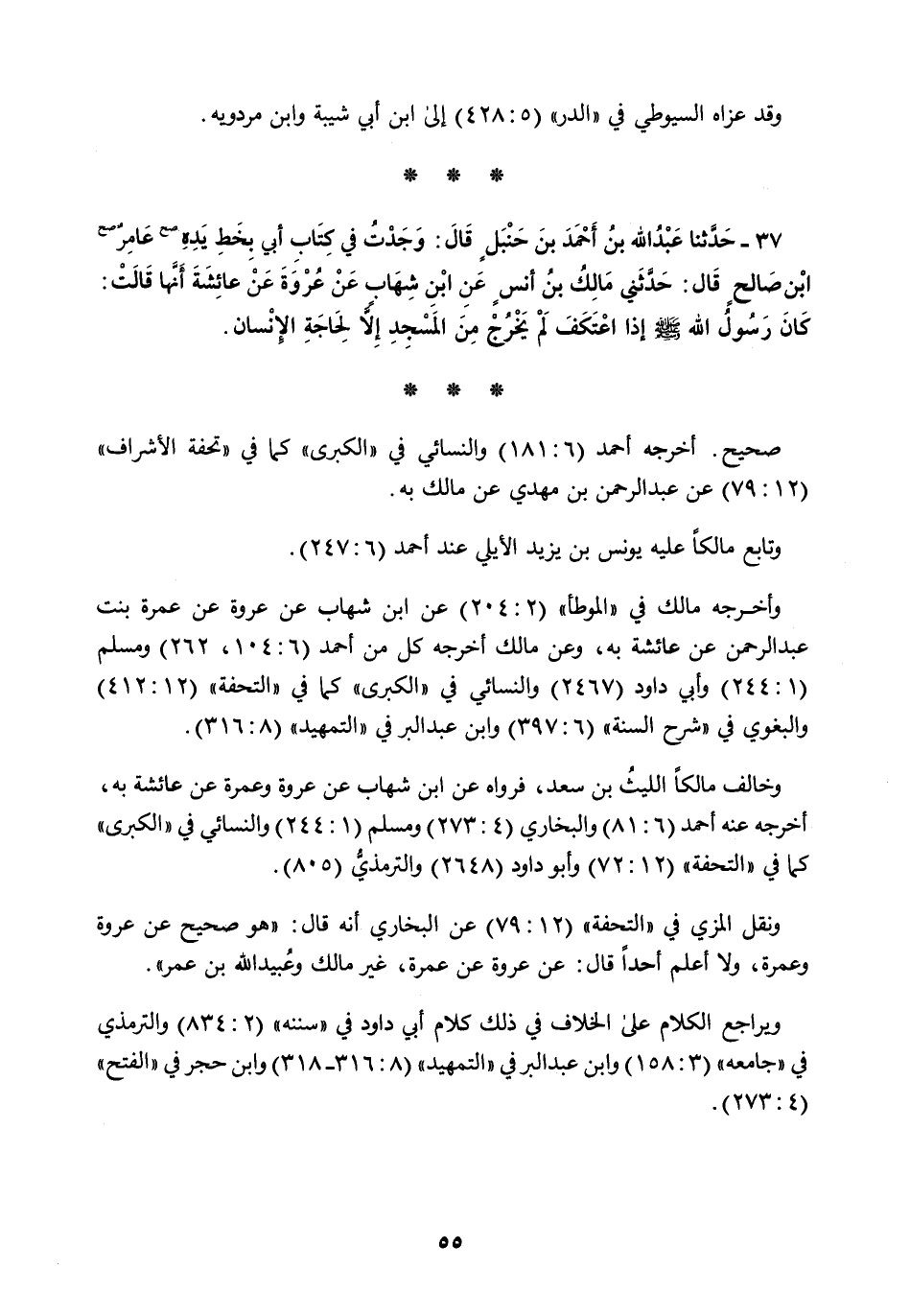 37 - حَدَّثَنَا عَبْدُ اللَّهِ بْنُ أَحْمَدَ بْنِ حَنْبَلٍ قَالَ: وَجَدْتُ فِي كِتَابِ أَبِي بِخَطِّ يَدِهِ عَامِرُ بْنُ صَالِحٍ قَالَ: حَدَّثَنِي مَالِكُ بْنُ أَنَسٍ، عَنِ ابْنِ شِهَابٍ، عَنْ عُرْوَةَ، عَنْ عَائِشَةَ، أَنَّهَا قَالَتْ كَانَ رَسُولُ اللَّهِ صَلَّى اللهُ عَلَيْهِ وَسَلَّمَ §إِذَا اعْتَكَفَ لَمْ يَخْرُجْ مِنَ الْمَسْجِدِ إِلَّا لِحَاجَةِ الْإِنْسَانِ