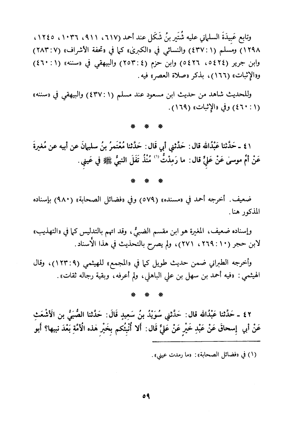 41 - حَدَّثَنَا عَبْدُ اللَّهِ قَالَ: حَدَّثَنِي أَبِي قَالَ: حَدَّثَنَا مُعْتَمِرُ بْنُ سُلَيْمَانَ، عَنْ أَبِيهِ، عَنْ مُغِيرَةَ، عَنْ أُمِّ مُوسَى، عَنْ عَلِيٍّ قَالَ: §مَا رَمِدْتُ مُنْذُ تَفَلَ النَّبِيُّ فِي عَيْنِي