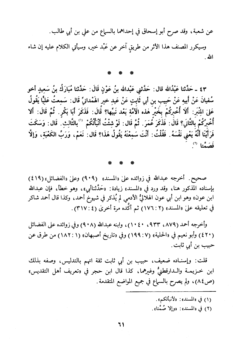 43 - حَدَّثَنَا عَبْدُ اللَّهِ قَالَ: حَدَّثَنِي عَبْدُ اللَّهِ بْنُ عَوْنٍ قَالَ: حَدَّثَنَا مُبَارَكُ بْنُ سَعِيدٍ، أَخُو سُفْيَانَ عَنْ أَبِيهِ، عَنْ حَبِيبِ بْنِ أَبِي ثَابِتٍ، عَنْ عَبْدِ خَيْرٍ الْهَمْدَانِيِّ قَالَ: سَمِعْتُ عَلِيًّا، يَقُولُ عَلَى الْمِنْبَرِ: " §أَلَا أُخْبِرُكُمْ بِخَيْرِ، هَذِهِ الْأُمَّةِ بَعْدَ نَبِيِّهَا؟ قَالَ: فَذَكَرَ أَبَا بَكْرٍ ثُمَّ قَالَ: أَلَا أُخْبِرُكُمْ بِالثَّانِي؟ قَالَ: فَذَكَرَ عُمَرَ، ثُمَّ قَالَ: لَوْ شِئْتُ أَنْبَأْتُكُمْ بِالثَّالِثِ قَالَ: وَسَكَتَ " فَرَأَيْنَا أَنَّهُ يَعْنِي نَفْسَهُ فَقُلْتُ أَنْتَ سَمِعْتَهُ يَقُولُ هَذَا؟ قَالَ: نَعَمْ وَرَبِّ الْكَعْبَةِ وَإِلَّا فَصُمَّتَا