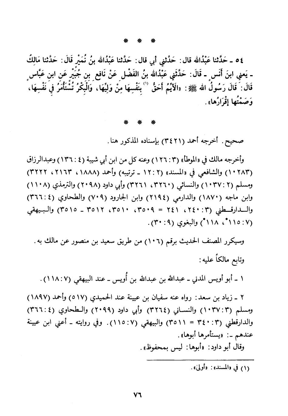 54 - حَدَّثَنَا عَبْدُ اللَّهِ قَالَ: حَدَّثَنِي أَبِي قَالَ: حَدَّثَنَا عَبْدُ اللَّهِ بْنُ نُمَيْرٍ قَالَ: حَدَّثَنَا مَالِكٌ يَعْنِي ابْنَ أَنَسٍ قَالَ: حَدَّثَنِي عَبْدُ اللَّهِ بْنُ الْفَضْلِ، عَنْ نَافِعِ بْنِ جُبَيْرٍ، عَنِ ابْنِ عَبَّاسٍ قَالَ: قَالَ رَسُولُ اللَّهِ صَلَّى اللهُ عَلَيْهِ وَسَلَّمَ: §«الْأَيِّمُ أَحَقُّ بِنَفْسِهَا مِنْ وَلِيِّهَا، وَالْبِكْرُ تُسْتَأْمَرُ فِي نَفْسِهَا، وَصَمْتُهَا إِقْرَارُهَا»