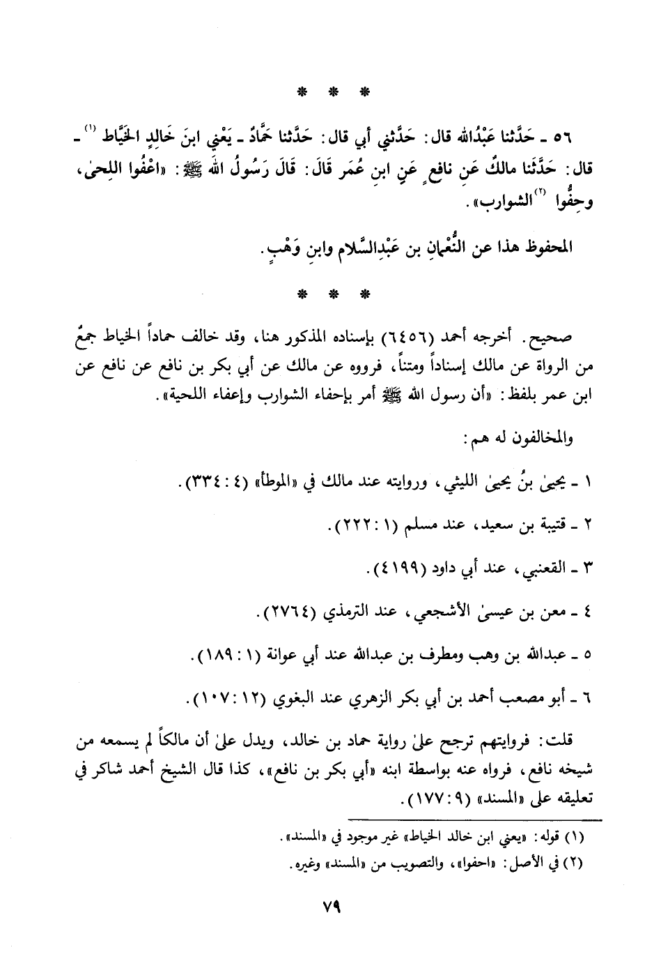 56 - حَدَّثَنَا عَبْدُ اللَّهِ قَالَ: حَدَّثَنِي أَبِي قَالَ: حَدَّثَنَا حَمَّادٌ يَعْنِي ابْنَ خَالِدٍ الْخَيَّاطَ قَالَ: حَدَّثَنَا مَالِكٌ، عَنْ نَافِعٍ، عَنِ ابْنِ عُمَرَ قَالَ: قَالَ رَسُولُ اللَّهِ صَلَّى اللهُ عَلَيْهِ وَسَلَّمَ: §«اعْفُوا اللِّحَى وَحِفُّوا الشَّوَارِبَ» الْمَحْفُوظُ هَذَا عَنِ النُّعْمَانِ بْنِ عَبْدِ السَّلَامِ وَابْنِ وَهْبٍ