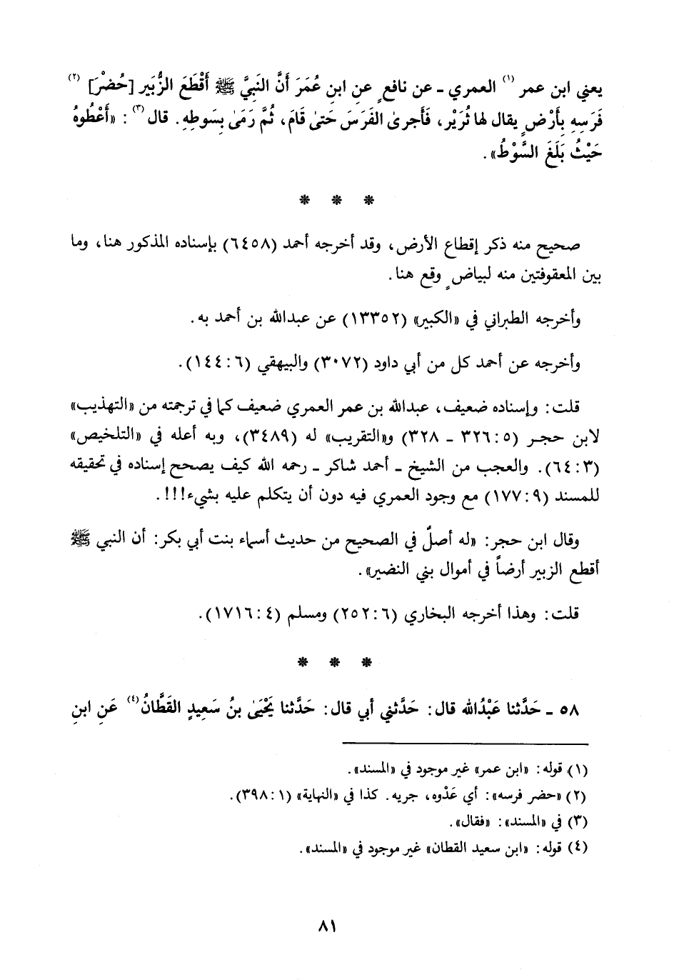 58 - حَدَّثَنَا عَبْدُ اللَّهِ قَالَ: حَدَّثَنِي أَبِي قَالَ: حَدَّثَنَا يَحْيَى بْنُ سَعِيدٍ الْقَطَّانُ، عَنِ ابْنِ -[82]- جُرَيْجٍ قَالَ: حُدِّثْتُ عَنِ الزُّهْرِيِّ، عَنْ عُبَيْدِ اللَّهِ بْنِ عَبْدِ اللَّهِ، عَنِ ابْنِ عَبَّاسٍ قَالَ: §«نَهَى رَسُولُ اللَّهِ صَلَّى اللهُ عَلَيْهِ وَسَلَّمَ عَنْ قَتْلِ النَّحْلَةِ، وَالنَّمْلَةِ، وَالصُّرَدِ، وَالْهُدْهُدِ» قَالَ يَحْيَى: وَرَأَيْتُ فِيَ كِتَابِ سُفْيَانَ عَنِ ابْنِ جُرَيْجٍ عَنِ ابْنِ أَبِي لَبِيدٍ عَنِ الزُّهْرِيِّ