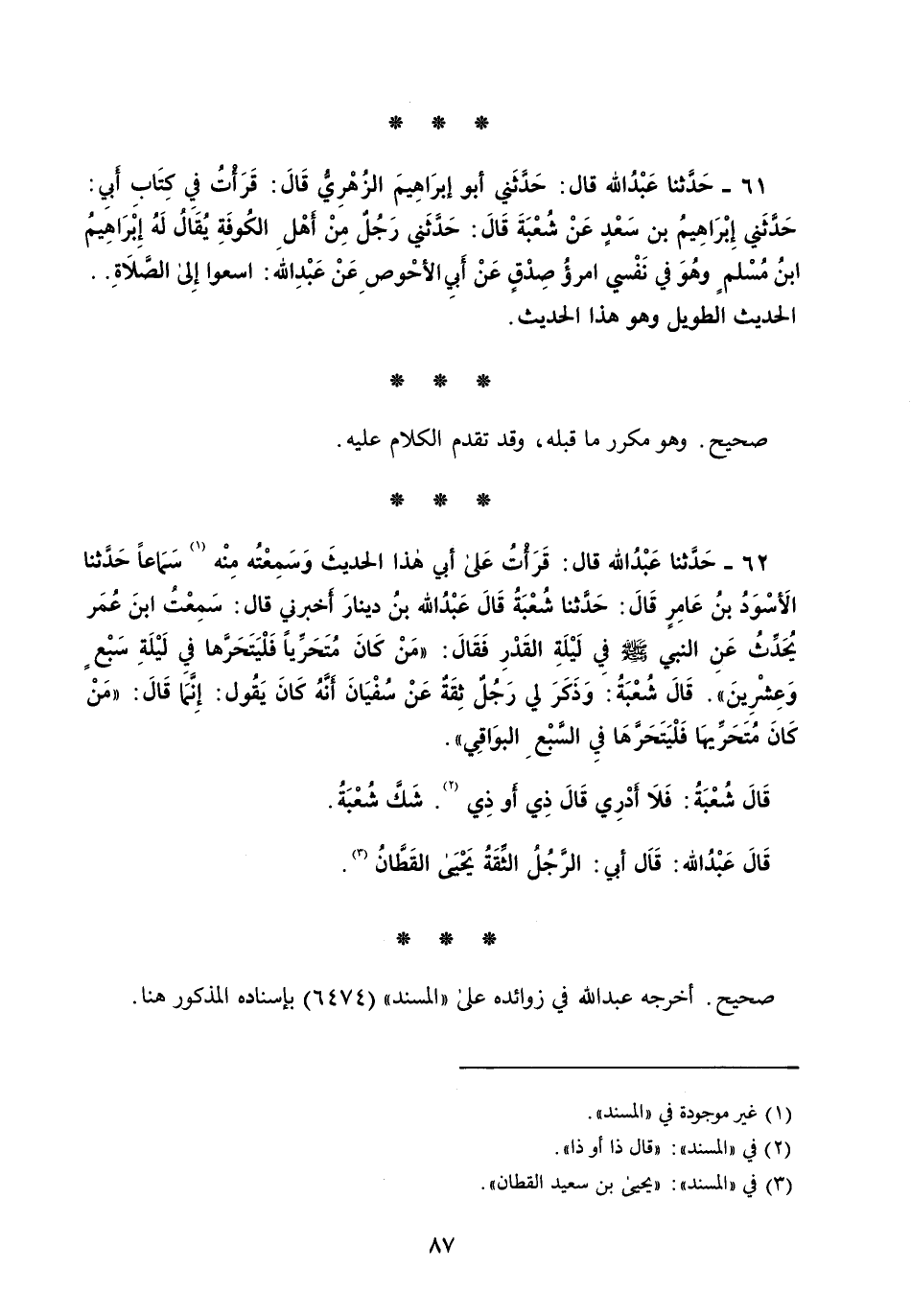 62 - حَدَّثَنَا عَبْدُ اللَّهِ قَالَ: قَرَأْتُ عَلَى أَبِي هَذَا الْحَدِيثَ وَسَمِعْتُهُ مِنْهُ، سَمَاعًا، حَدَّثَنَا الْأَسْوَدُ بْنُ عَامِرٍ قَالَ: حَدَّثَنَا شُعْبَةُ قَالَ عَبْدُ اللَّهِ بْنُ دِينَارٍ أَخْبَرَنِي قَالَ: سَمِعْتُ ابْنَ عُمَرَ، يُحَدِّثُ عَنِ النَّبِيِّ صَلَّى اللهُ عَلَيْهِ وَسَلَّمَ فِي لَيْلَةِ الْقَدْرِ فَقَالَ: §" مَنْ كَانَ مُتَحَرِّيًا فَلْيَتَحَرَّهَا فِي لَيْلَةِ سَبْعٍ وَعِشْرِينَ قَالَ شُعْبَةُ: وَذَكَرَ لِي رَجُلٌ ثِقَةٌ عَنْ سُفْيَانَ أَنَّهُ كَانَ يَقُولُ: إِنَّمَا قَالَ: «مَنْ كَانَ مُتَحَرِّيَهَا فَلْيَتَحَرَّهَا فِي السَّبْعِ الْبَوَاقِي» قَالَ شُعْبَةُ: فَلَا أَدْرِي قَالَ ذِي أَوْ ذِي شَكَّ شُعْبَةُ قَالَ عَبْدُ اللَّهِ: قَالَ أَبِي: الرَّجُلُ الثِّقَةُ يَحْيَى الْقَطَّانُ