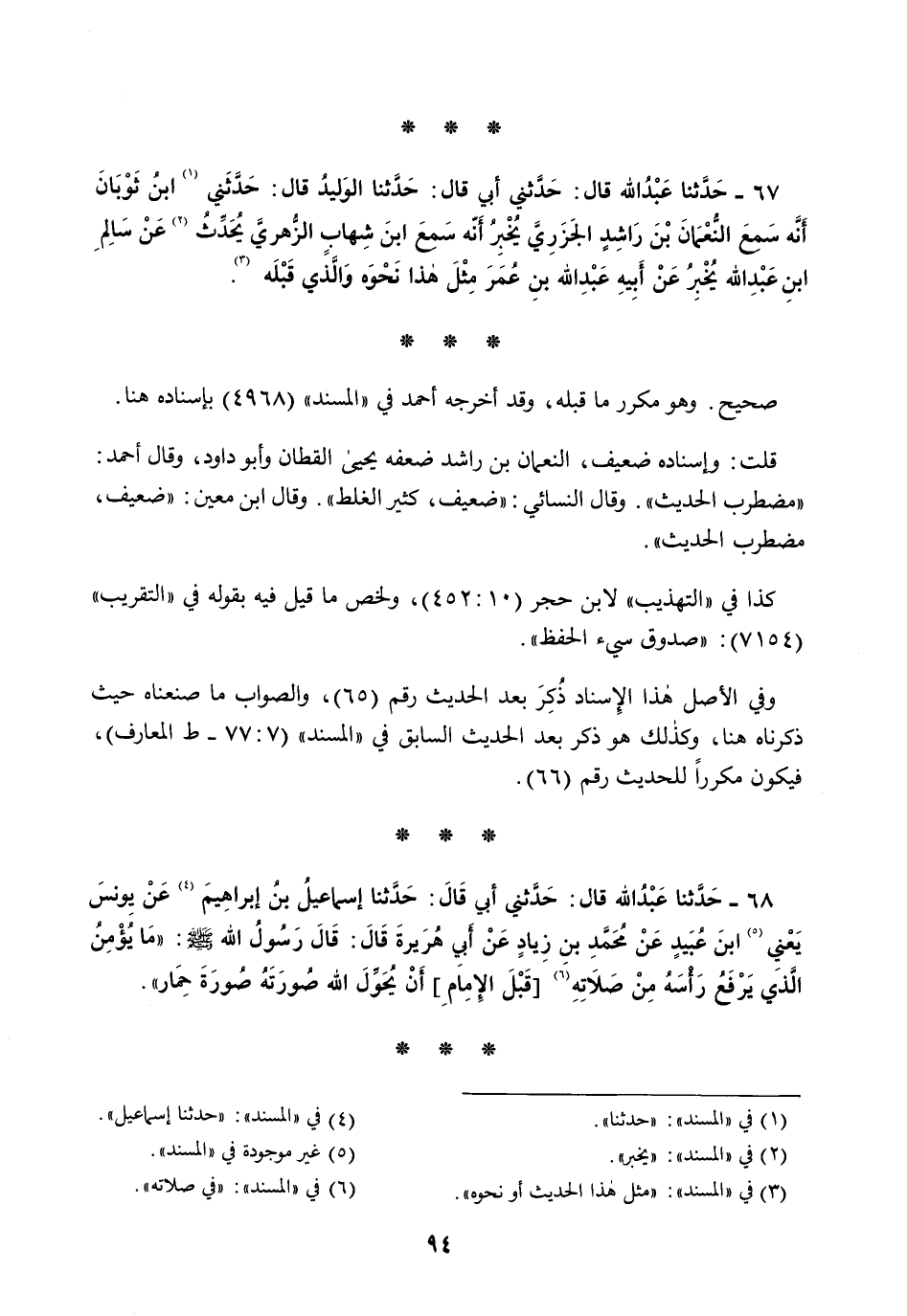 68 - حَدَّثَنَا عَبْدُ اللَّهِ قَالَ: حَدَّثَنِي أَبِي قَالَ: حَدَّثَنَا إِسْمَاعِيلُ بْنُ إِبْرَاهِيمَ، عَنْ يُونُسَ يَعْنِي ابْنَ عُبَيْدٍ، عَنْ مُحَمَّدِ بْنِ زِيَادٍ، عَنْ أَبِي هُرَيْرَةَ قَالَ: قَالَ رَسُولُ اللَّهِ صَلَّى اللهُ عَلَيْهِ وَسَلَّمَ: §«مَا يُؤْمِنُ الَّذِي يَرْفَعُ رَأْسَهُ مِنْ صَلَاتِهِ قَبْلَ الْإِمَامِ أَنْ يُحَوِّلَ اللَّهُ صُورَتَهُ صُورَةَ حِمَارٍ»