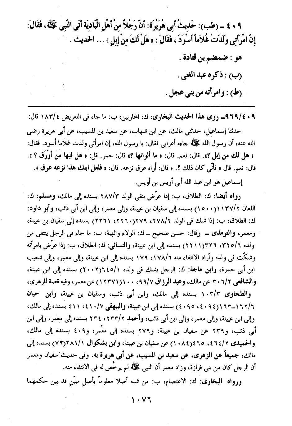 409- (طب): حديث أبي هريرة: أن رجلاً من أهل البادية أتى النبي صلى الله عليه وسلم، فقال: إن امرأتي ولدت غلاماً أسود، فقال: ((هل لك من إبلٍ)) .. .. الحديث.