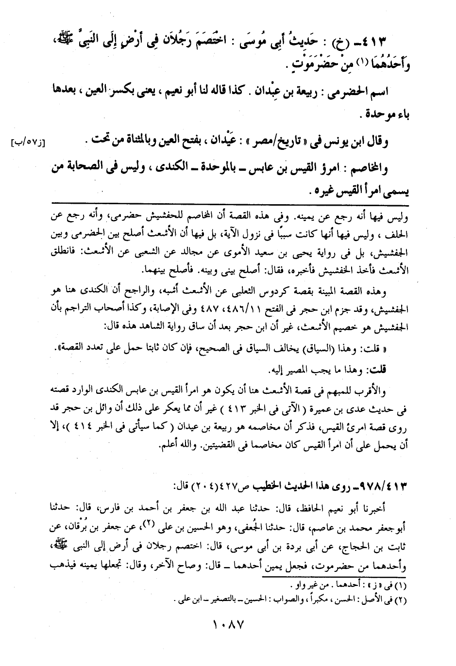 413- (خ): حديث أبي موسى: اختصم رجلان في أرضٍ إلى النبي صلى الله عليه وسلم، وأحدهما من حضرموت.