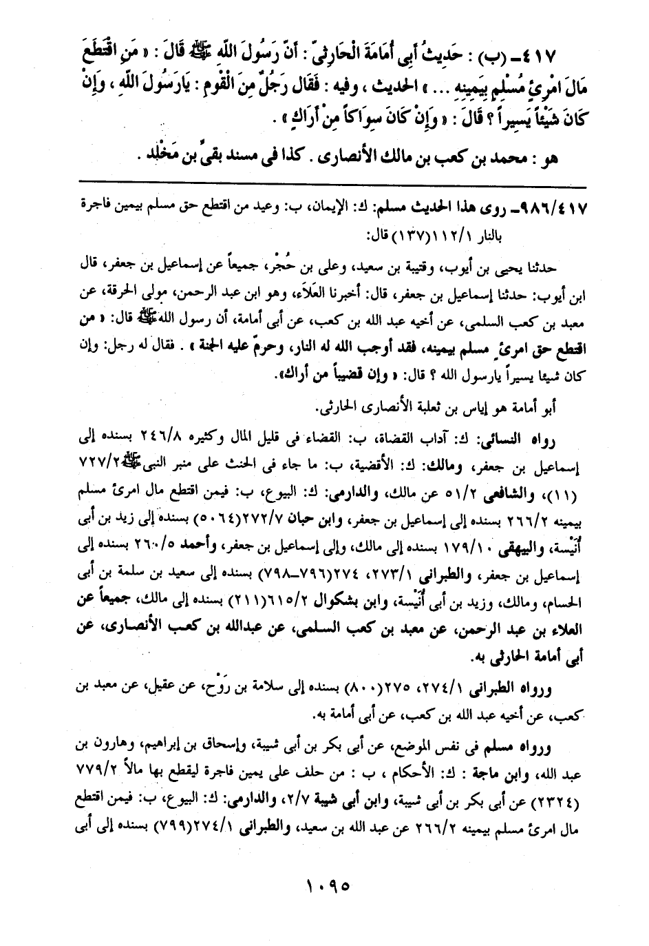 417- (ب): حديث أبي أمامة الحارثي: أن رسول الله صلى الله عليه وسلم قال: ((من اقتطع مال امرئٍ مسلمٍ بيمينه .. .. )) الحديث، وفيه: فقال رجلٌ من القوم: يا رسول الله، وإن كان شيئاً يسيراً؟ قال: ((وإن كان سواكاً من أراكٍ)).