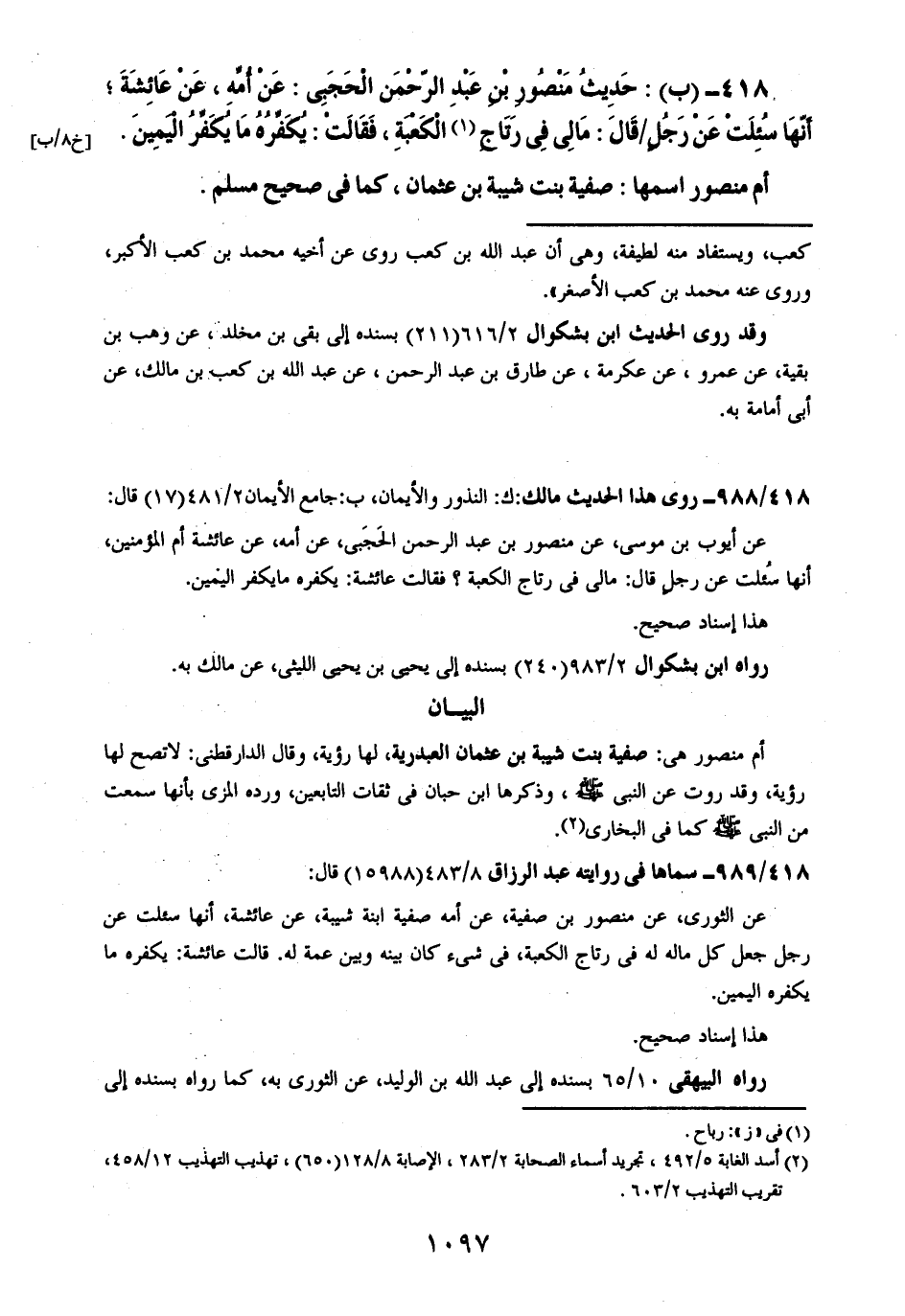 418- (ب): حديث منصور بن عبد الرحمن الحجبي: عن أمه، عن عائشة؛ أنها سئلت عن رجلٍ قال: مالي في رتاج الكعبة، فقالت: يكفره ما يكفر اليمين.