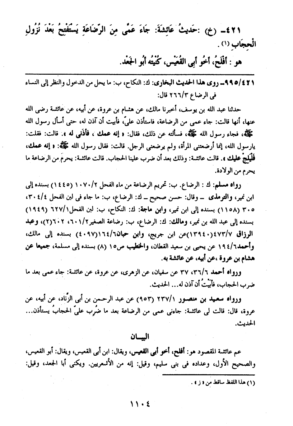 421- (خ): حديث عائشة: جاء عمي من الرضاعة يستفتح بعد نزول الحجاب.