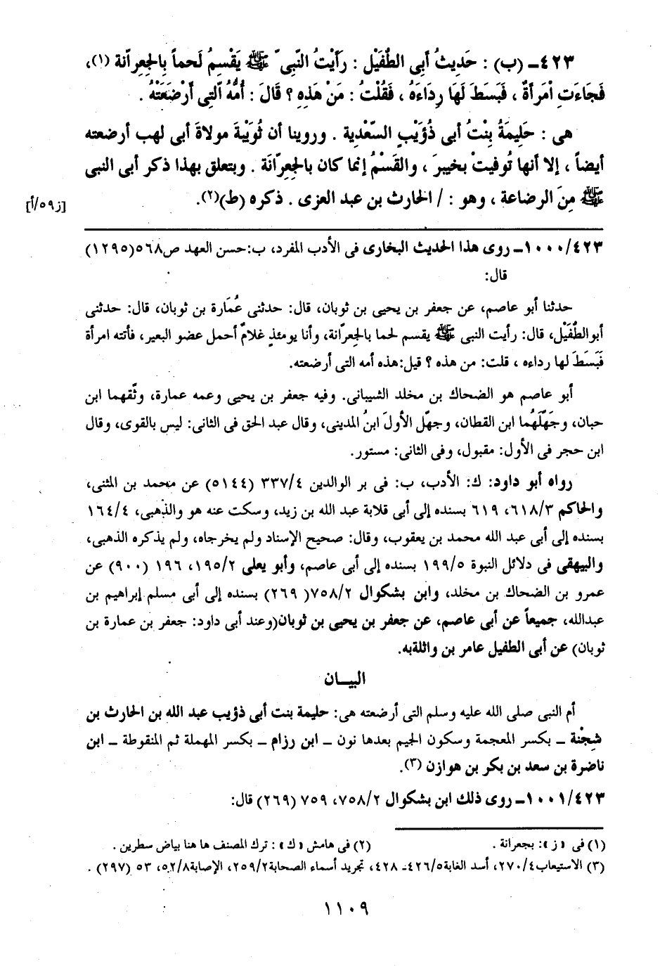 423- (ب): حديث أبي الطفيل: رأيت النبي صلى الله عليه وسلم يقسم لحماً بالجعرانة، فجاءت امرأةٌ، فبسط لها رداءه، فقلت: من هذه؟ قال: أمه التي أرضعته.