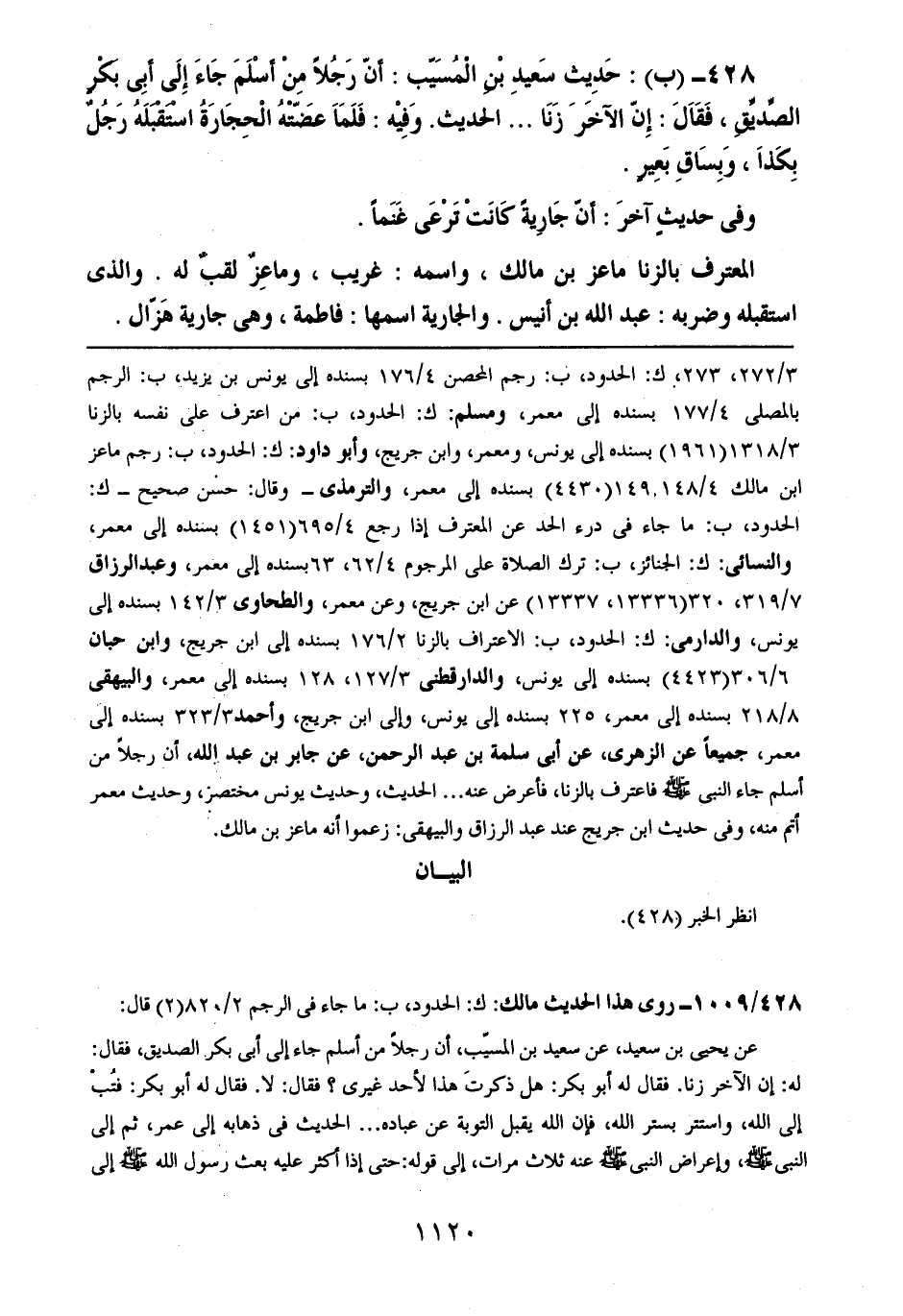 428- (ب): حديث سعيد بن المسيب: أن رجلاً من أسلم جاء إلى أبي بكر الصديق، فقال: إن الآخر زنا .. .. الحديث. وفيه: فلما عضته الحجارة استقبله رجلٌ بكذا، وبساق بعيرٍ.