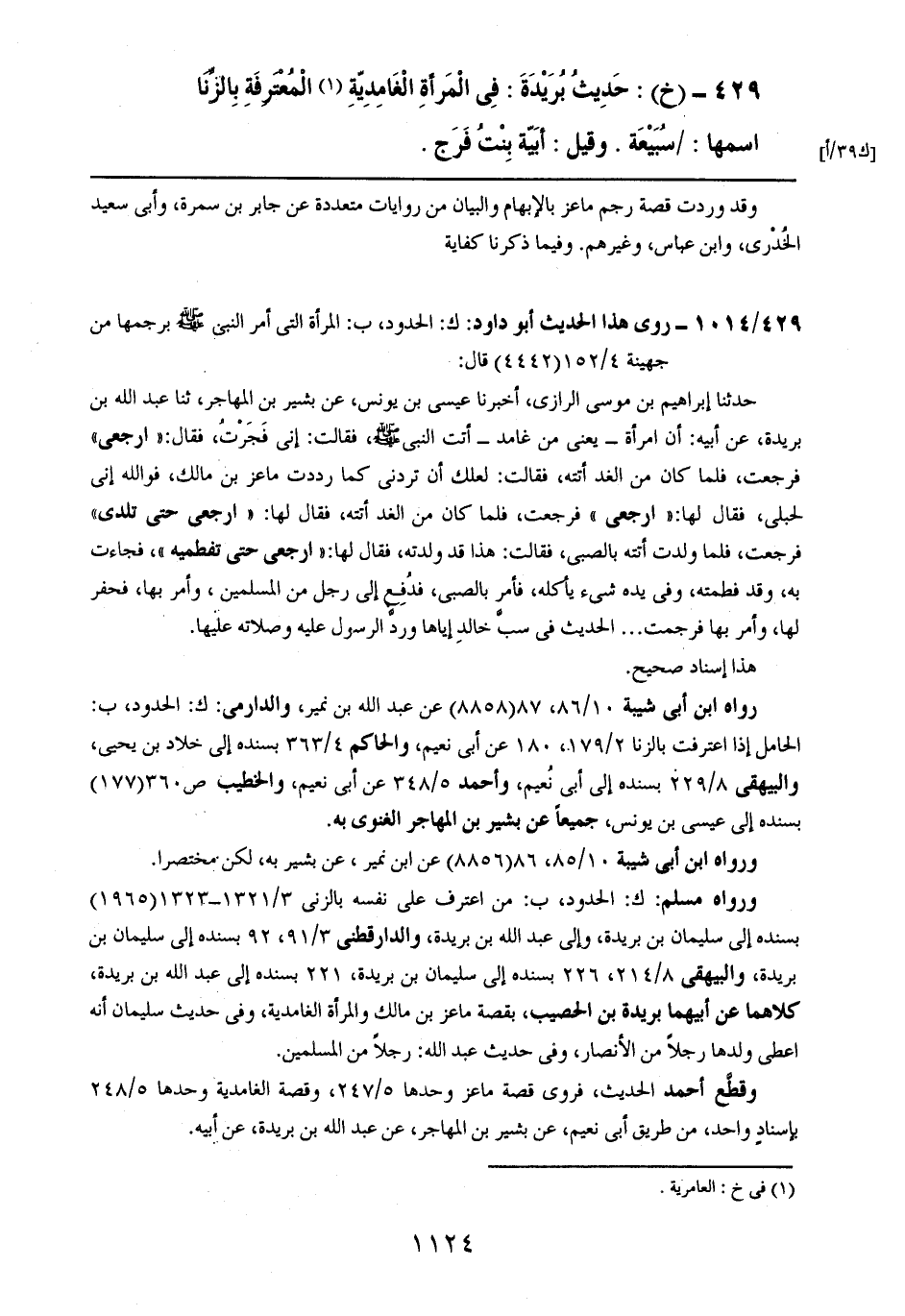 429- (خ): حديث بريدة: في المرأة الغامدية المعترفة بالزنا.