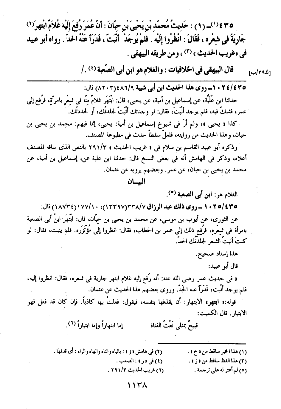 435- (1): حديث محمد بن يحيى بن حبان: أن عمر رفع إليه غلام ابتهر جارية في شعره، فقال: انظروا إليه. فلم يوجد أنبت، فدرأ عنه الحد. روواه أبو عبيد في ((غريب الحديث))، ومن طريقه البيهقي.