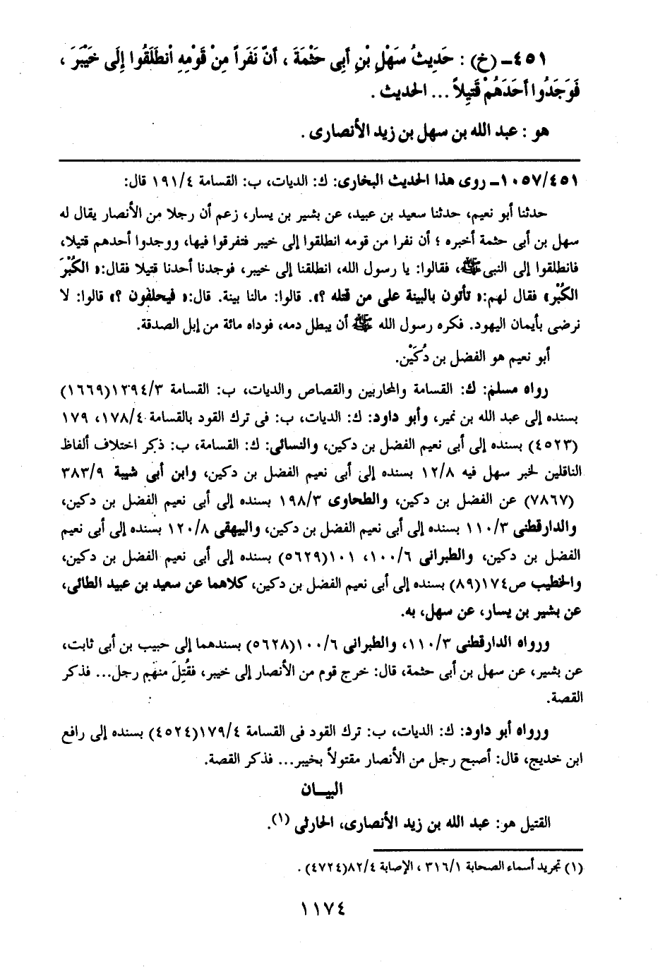 451- (خ): حديث سهل بن أبي حثمة، أن نفراً من قومه انطلقوا إلى خيبر، فوجدوا أحدهم قتيلاً .. .. الحديث.